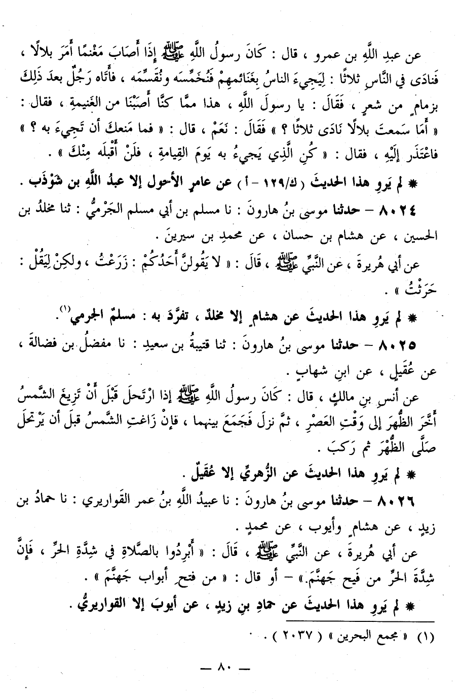 8025 - حَدَّثَنَا مُوسَى بْنُ هَارُونَ، ثَنَا قُتَيْبَةُ بْنُ سَعِيدٍ، نا مُفَضَّلُ بْنُ فَضَالَةَ، عَنْ عُقَيْلٍ، عَنِ ابْنِ شِهَابٍ، عَنْ أَنَسِ بْنِ مَالِكٍ قَالَ: «كَانَ رَسُولُ اللَّهِ صَلَّى اللهُ عَلَيْهِ وَسَلَّمَ §إِذَا ارْتَحَلَ قَبْلَ أَنْ تَزِيغَ الشَّمْسُ أَخِّرَ الظُّهْرَ إِلَى وَقْتِ الْعَصْرِ، ثُمَّ نَزَلَ فَجَمَعَ بَيْنَهُمَا، فَإِنْ زَاغَتِ الشَّمْسُ قَبْلَ أَنْ يَرْتَحِلَ صَلَّى الظُّهْرَ، ثُمَّ رَكِبَ»