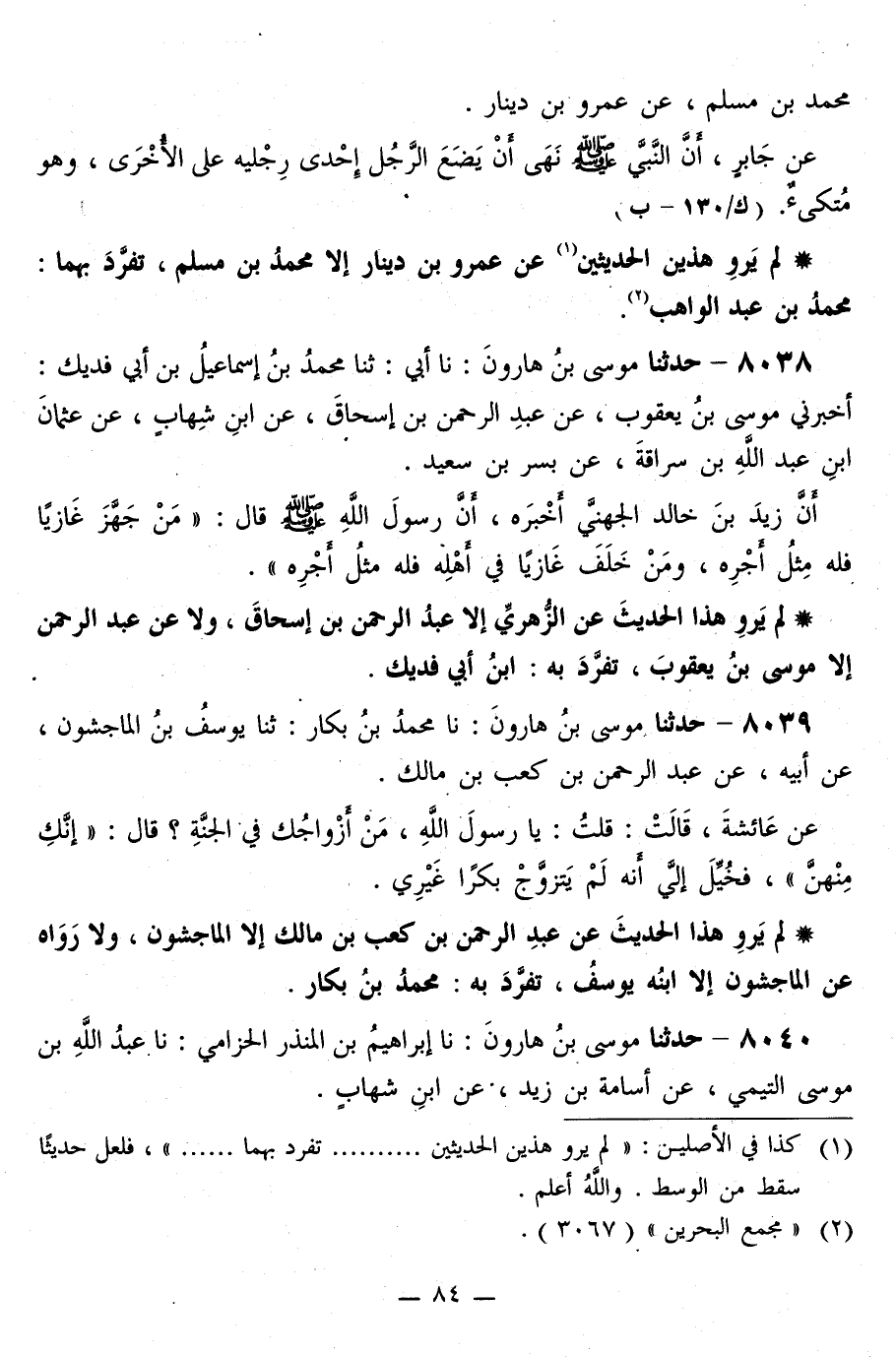 8038 - حَدَّثَنَا مُوسَى بْنُ هَارُونَ، نا أَبِي، ثَنَا مُحَمَّدُ بْنُ إِسْمَاعِيلَ بْنِ أَبِي فُدَيْكٍ، أَخْبَرَنِي مُوسَى بْنُ يَعْقُوبَ، عَنْ عَبْدِ الرَّحْمَنِ بْنِ إِسْحَاقَ، عَنِ ابْنِ شِهَابٍ، عَنْ عُثْمَانَ بْنِ عَبْدِ اللَّهِ بْنِ سُرَاقَةَ، عَنْ بُسْرِ بْنِ سَعِيدٍ، أَنَّ زَيْدَ بْنَ خَالِدٍ الْجُهَنِيَّ، أَخْبَرَهُ، أَنَّ رَسُولَ اللَّهِ صَلَّى اللهُ عَلَيْهِ وَسَلَّمَ قَالَ: «§مَنْ جَهَّزَ غَازِيًا فَلَهُ مِثْلُ أَجْرِهِ، وَمَنْ خَلَفَ غَازِيًا فِي أَهْلِهِ فَلَهُ مِثْلُ أَجْرِهِ»