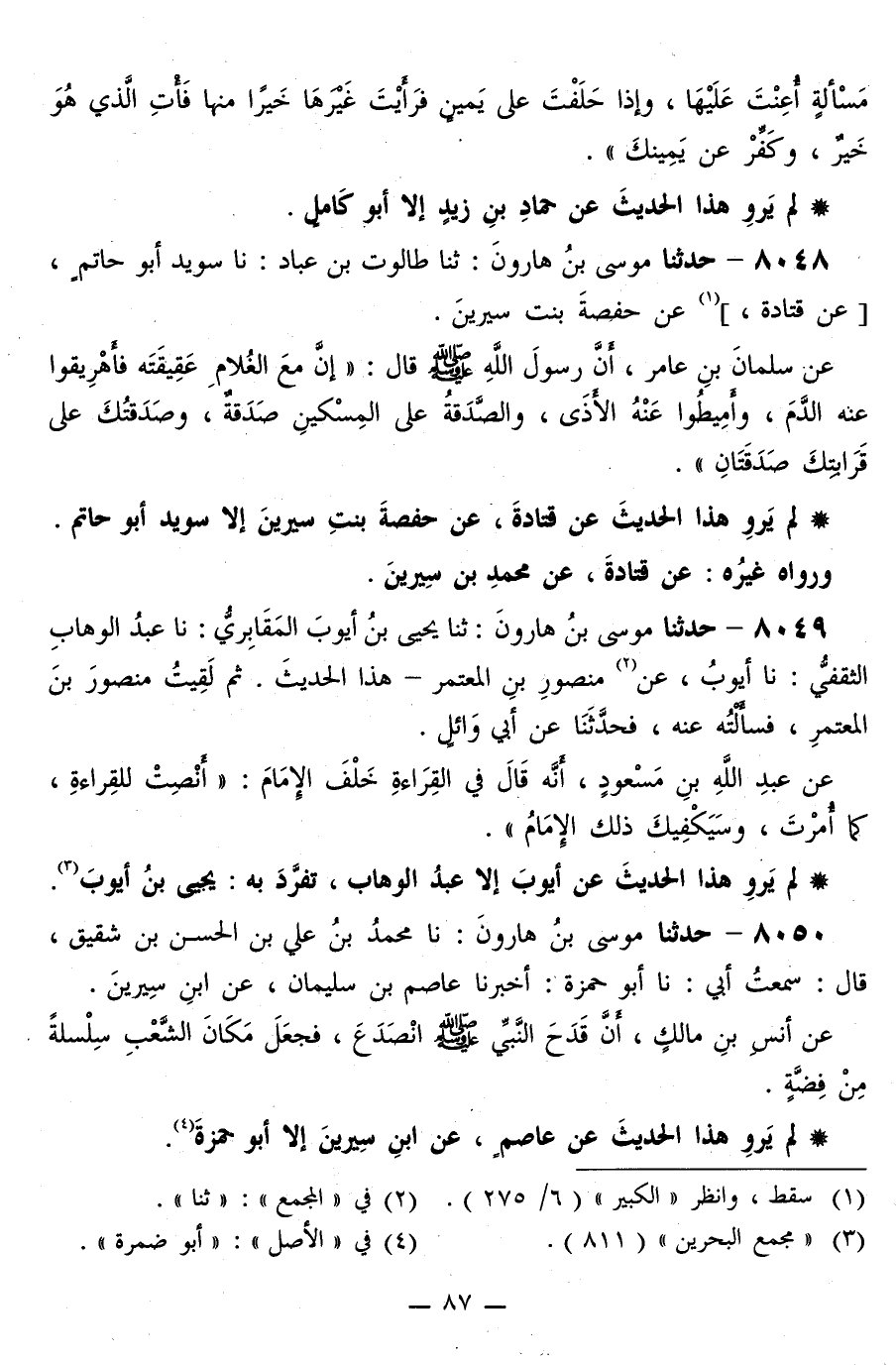 8049 - حَدَّثَنَا مُوسَى بْنُ هَارُونَ، ثَنَا يَحْيَى بْنُ أَيُّوبَ الْمَقَابِرِيُّ، نا عَبْدُ الْوَهَّابِ الثَّقَفِيُّ، نا أَيُّوبُ، عَنْ مَنْصُورِ بْنِ الْمُعْتَمِرِ، هَذَا الْحَدِيثَ ثُمَّ لَقِيتُ مَنْصُورَ بْنَ الْمُعْتَمِرِ، فَسَأَلْتُهُ عَنْهُ فَحَدَّثَنَا، عَنْ أَبِي وَائِلٍ، عَنْ عَبْدِ اللَّهِ بْنِ مَسْعُودٍ، أَنَّهُ قَالَ فِي §الْقِرَاءَةِ خَلْفَ الْإِمَامِ: «أَنْصِتْ لِلْقِرَاءَةِ كَمَا أُمِرْتَ، وَسَيَكْفِيكَ ذَلِكَ الْإِمَامُ»