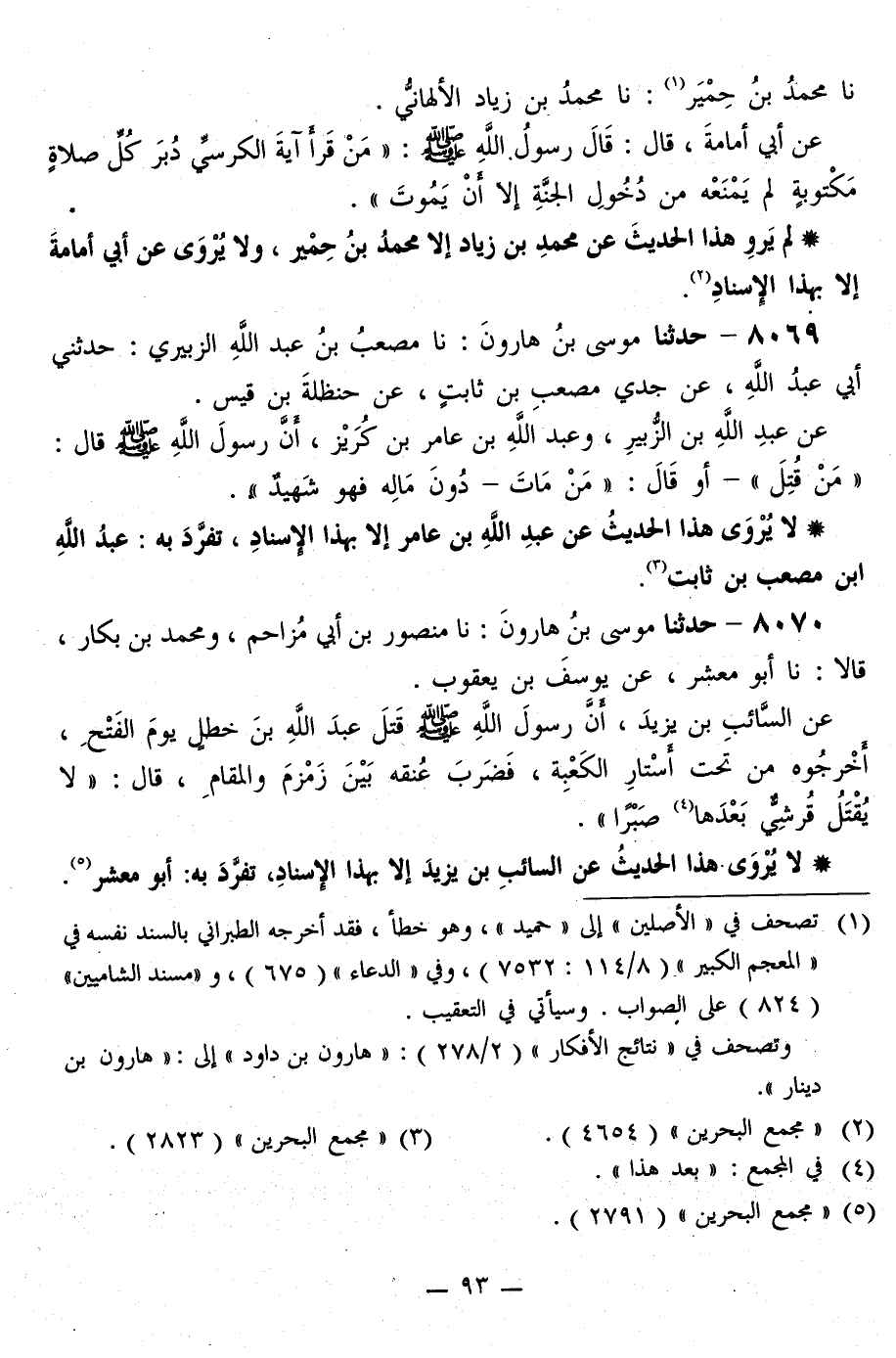 8070 - حَدَّثَنَا مُوسَى بْنُ هَارُونَ، نا مَنْصُورُ بْنُ أَبِي مُزَاحِمٍ، وَمُحَمَّدُ بْنُ بَكَّارٍ، قَالَا: نا أَبُو مَعْشَرٍ، عَنْ يُوسُفَ بْنِ يَعْقُوبَ، عَنِ السَّائِبِ بْنِ يَزِيدَ، أَنَّ رَسُولَ اللَّهِ صَلَّى اللهُ عَلَيْهِ وَسَلَّمَ «قَتَلَ عَبْدَ اللَّهِ بْنَ خَطَلٍ يَوْمَ الْفَتْحِ» ، أَخْرَجُوهُ مِنْ تَحْتِ أَسْتَارِ الْكَعْبَةِ، فَضَرَبَ عُنُقَهُ بَيْنَ زَمْزَمٍ، وَالْمَقَامِ قَالَ: «§لَا يُقْتَلُ قُرَشِيُّ بَعْدَهَا صَبْرًا»