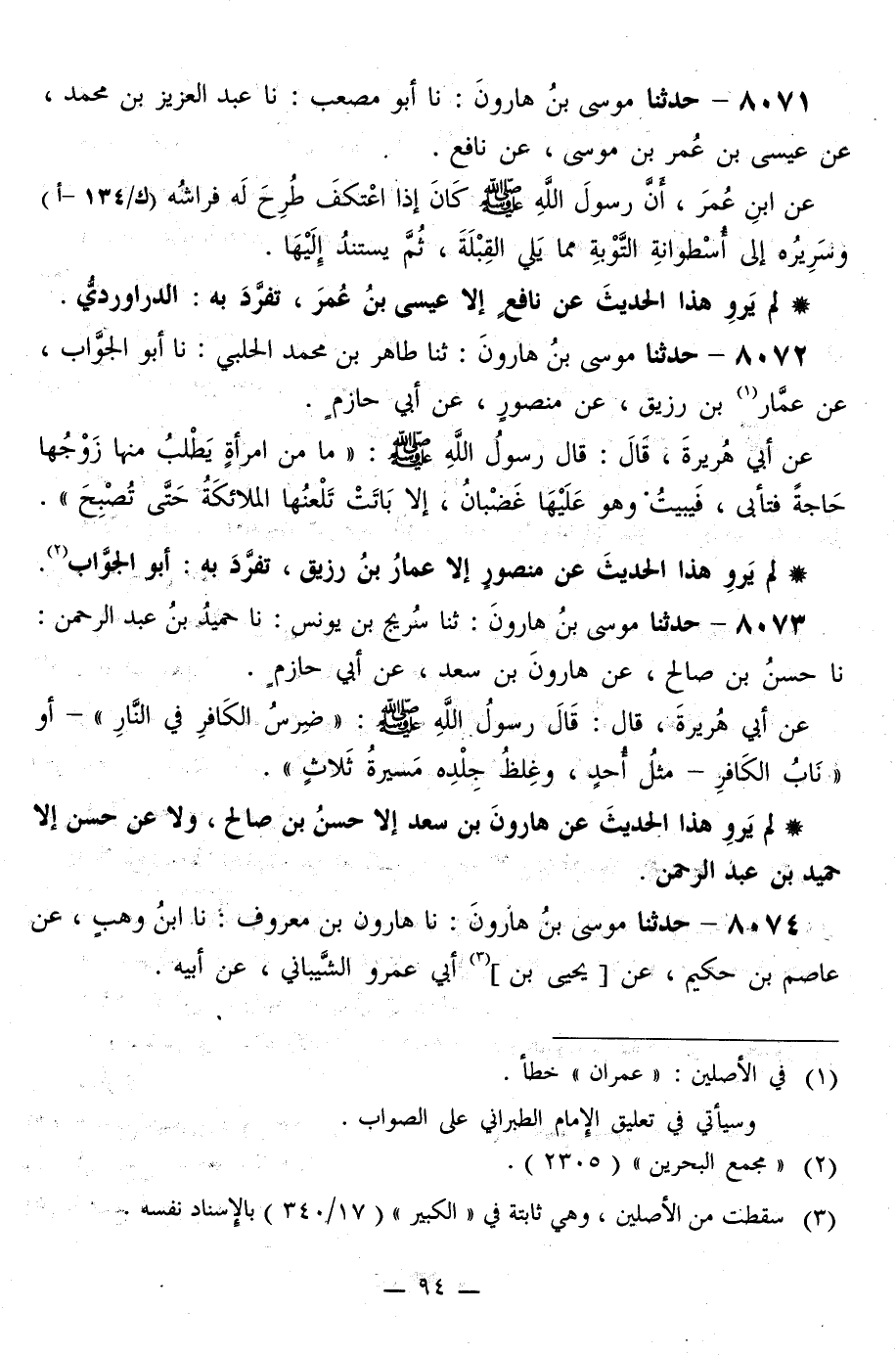 8072 - حَدَّثَنَا مُوسَى بْنُ هَارُونَ، ثَنَا طَاهِرُ بْنُ مُحَمَّدٍ الْحَلَبِيُّ، نا أَبُو الْجَوَّابِ، عَنْ عَمَّارِ بْنِ رُزَيْقٍ، عَنْ مَنْصُورٍ، عَنْ أَبِي حَازِمٍ، عَنْ أَبِي هُرَيْرَةَ قَالَ: قَالَ رَسُولُ اللَّهِ صَلَّى اللهُ عَلَيْهِ وَسَلَّمَ: «§مَا مِنَ امْرَأَةٍ يَطْلُبُ مِنْهَا زَوْجُهَا حَاجَةً، فَتَأْبَى فَيَبِيتُ، وَهُوَ عَلَيْهَا غَضْبَانُ إِلَّا بَاتَتْ تَلْعَنُهَا الْمَلَائِكَةُ حَتَّى تُصْبِحَ»