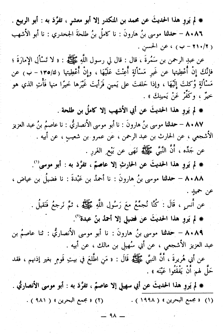 8086 - حَدَّثَنَا مُوسَى بْنُ هَارُونَ، نا كَامِلُ بْنُ طَلْحَةَ الْجَحْدَرِيُّ، نا أَبُو الْأَشْهَبِ، عَنِ الْحَسَنِ، عَنْ عَبْدِ الرَّحْمَنِ بْنِ سَمُرَةَ قَالَ: قَالَ لِي رَسُولُ اللَّهِ صَلَّى اللهُ عَلَيْهِ وَسَلَّمَ: «§لَا تَسْأَلِ الْإِمَارَةَ، فَإِنَّكَ إِنْ أُعْطِيتَهَا عَنْ غَيْرِ مَسْأَلَةٍ أُعِنْتَ عَلَيْهَا، وَإِنْ أُعْطِيتَهَا عَنْ مَسْأَلَةِ وُكِلْتَ إِلَيْهَا، وَإِذَا حَلَفْتَ عَلَى يَمِينٍ فَرَأَيْتَ غَيْرَهَا خَيْرًا مِنْهَا فَأْتِ الَّذِي هُوَ خَيْرٌ، وَكَفِّرْ عَنْ يَمِينِكَ»