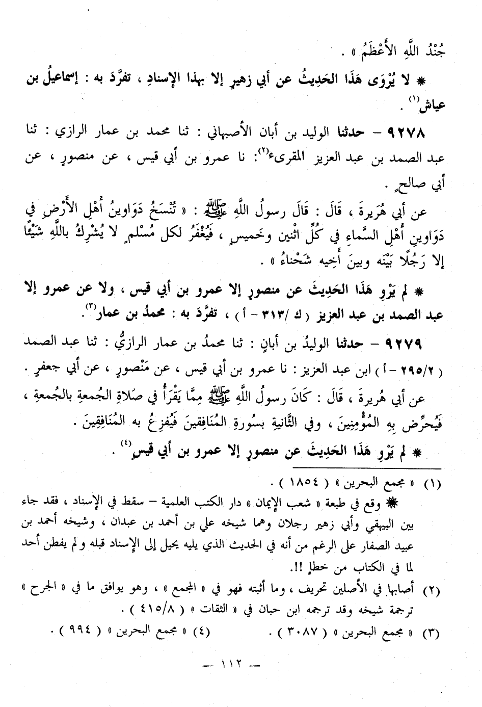 9278 - حَدَّثَنَا الْوَلِيدُ بْنُ أَبَانَ الْأَصْبَهَانِيُّ، ثَنَا مُحَمَّدُ بْنُ عَمَّارٍ الرَّازِيُّ، ثَنَا عَبْدُ الصَّمَدِ بْنُ عَبْدِ الْعَزِيزِ الْمُقْرِئُ، نَا عَمْرُو بْنُ أَبِي قَيْسٍ، عَنْ مَنْصُورٍ، عَنْ أَبِي صَالِحٍ، عَنْ أَبِي هُرَيْرَةَ، قَالَ: قَالَ رَسُولُ اللَّهِ صَلَّى اللهُ عَلَيْهِ وَسَلَّمَ: «§تُنْسَخُ دَوَاوِينُ أَهْلِ الْأَرْضِ فِي دَوَاوِينِ أَهْلِ السَّمَاءِ فِي كُلِّ اثْنَيْنٍ وَخَمِيسٍ، فَيُغْفَرُ لِكُلِّ مُسْلِمٍ لَا يُشْرَكُ بِاللَّهِ شَيْئًا إِلَّا رَجُلًا بَيْنَهُ وَبَيْنَ أَخِيهِ شَحْنَاءُ»