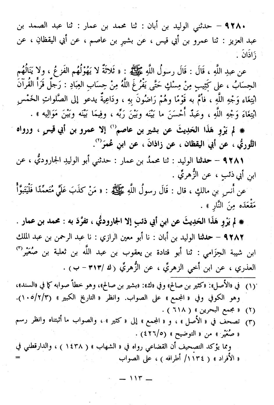 9281 - حَدَّثَنَا الْوَلِيدُ، ثَنَا مُحَمَّدُ بْنُ عَمَّارٍ، حَدَّثَنِي أَبُو الْوَلِيدِ الْجَارُودِيُّ، عَنِ ابْنِ أَبِي ذِئْبٍ، عَنِ الزُّهْرِيِّ، عَنْ أَنَسِ بْنِ مَالِكٍ، قَالَ: قَالَ رَسُولُ اللَّهِ صَلَّى اللهُ عَلَيْهِ وَسَلَّمَ: «§مَنْ كَذَبَ عَلَيَّ مُتَعَمِّدًا فَلْيَتَبَوَّأْ مَقْعَدَهُ مِنَ النَّارِ»