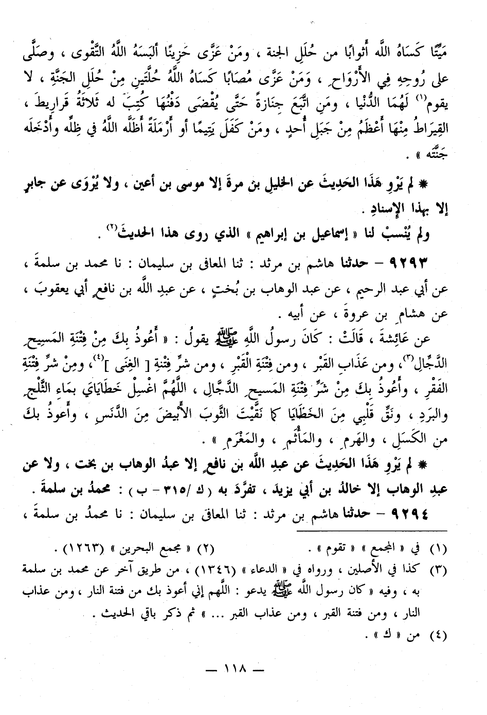 9293 - حَدَّثَنَا هَاشِمُ بْنُ مَرْثَدٍ، ثَنَا الْمُعَافَى بْنُ سُلَيْمَانَ، نَا مُحَمَّدُ بْنُ سَلَمَةَ، عَنْ أَبِي عَبْدِ الرَّحِيمِ، عَنْ عَبْدِ الْوَهَّابِ بْنِ بُخْتٍ، عَنْ عَبْدِ اللَّهِ بْنِ نَافِعٍ أَبِي يَعْقُوبَ، عَنْ هِشَامِ بْنِ عُرْوَةَ، عَنْ أَبِيهِ، عَنْ عَائِشَةَ، قَالَتْ: كَانَ رَسُولُ اللَّهِ صَلَّى اللهُ عَلَيْهِ وَسَلَّمَ يَقُولُ: «§أَعُوذُ بِكَ مِنْ فِتْنَةِ الْمَسِيحِ الدَّجَّالِ، وَمِنْ عَذَابِ الْقَبْرِ، وَمِنْ فِتْنَةِ الْقَبْرِ، وَمِنْ شَرِّ فِتْنَةِ الْغِنَى، وَمِنْ شَرِّ فِتْنَةِ الْفَقْرِ، وَأَعُوذُ بِكَ مِنْ شَرِّ فِتْنَةِ الْمَسِيحِ الدَّجَّالِ، اللَّهُمَّ اغْسِلْ خَطَايَايَ بِمَاءِ الثَّلْجِ وَالْبَرَدِ، وَنَقِّ قَلْبِي مِنَ الْخَطَايَا كَمَا نَقَّيْتَ الثَّوْبَ الْأَبْيَضَ مِنَ الدَّنَسِ، وَأَعُوذُ بِكَ مِنَ الْكَسَلِ وَالْهَرَمِ وَالْمَأْثَمِ وَالْمَغْرَمِ»
