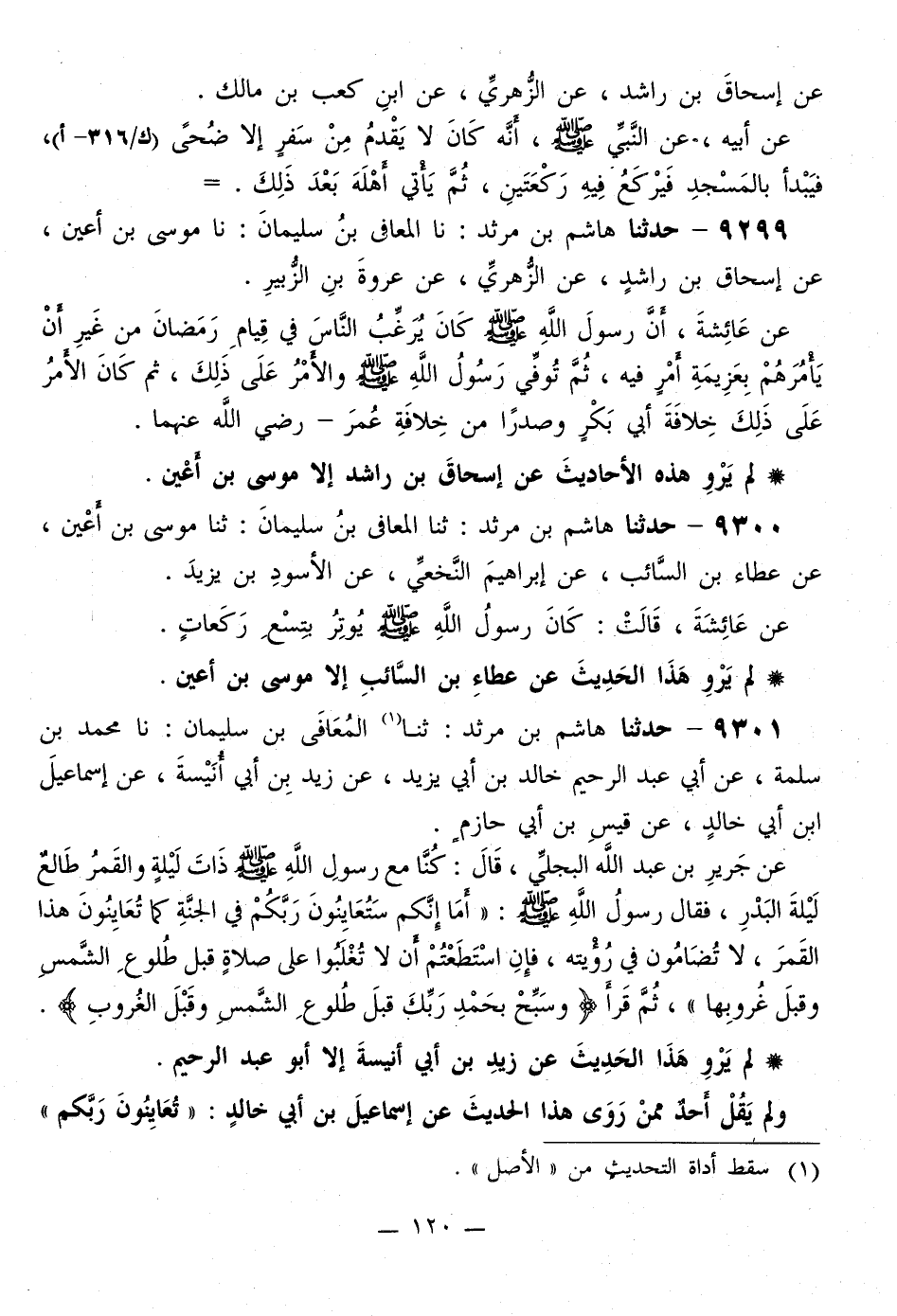 9301 - حَدَّثَنَا هَاشِمُ بْنُ مَرْثَدٍ، ثَنَا الْمُعَافَى بْنُ سُلَيْمَانَ، نَا مُحَمَّدُ بْنُ سَلَمَةَ، عَنْ أَبِي عَبْدِ الرَّحِيمِ خَالِدِ بْنِ أَبِي يَزِيدَ، عَنْ زَيْدِ بْنِ أَبِي أُنَيْسَةَ، عَنْ إِسْمَاعِيلَ بْنِ أَبِي خَالِدٍ، عَنْ قَيْسِ بْنِ أَبِي حَازِمٍ، عَنْ جَرِيرِ بْنِ عَبْدِ اللَّهِ الْبَجَلِيِّ، قَالَ: كُنَّا مَعَ رَسُولِ اللَّهِ صَلَّى اللهُ عَلَيْهِ وَسَلَّمَ ذَاتَ لَيْلَةٍ وَالْقَمَرُ طَالِعٌ لَيْلَةَ الْبَدْرِ، فَقَالَ رَسُولُ اللَّهِ صَلَّى اللهُ عَلَيْهِ وَسَلَّمَ: «أَمَا إِنَّكُمْ §سَتُعَايِنُونَ رَبَّكُمْ فِي الْجَنَّةِ كَمَا تُعَاينُونَ هَذَا الْقَمَرَ، لَا تُضَامُونَ فِي رُؤْيَتِهِ، فَإِنِ اسْتَطَعْتُمْ أَنْ لَا تُغْلَبُوا عَلَى صَلَاةٍ قَبْلَ طُلُوعِ الشَّمْسِ وَقَبْلَ غُرُوبِهَا» ، ثُمَّ قَرَأَ {وَسَبِّحْ بِحَمْدِ رَبِّكَ قَبْلَ طُلُوعِ الشَّمْسِ وَقَبْلَ الْغُرُوبِ} [ق: 39] لَمْ يَرْوِ هَذَا الْحَدِيثَ عَنْ زَيْدِ بْنِ أَبِي أُنَيْسَةَ إِلَّا أَبُو عَبْدِ الرَّحِيمِ. وَلَمْ يَقُلْ أَحَدٌ مِمَّنْ رَوَى هَذَا الْحَدِيثَ عَنْ إِسْمَاعِيلَ بْنِ أَبِي خَالِدٍ: «تُعَاينُونَ رَبَّكُمْ» -[121]- إِلَّا زَيْدُ بْنُ أَبِي أُنَيْسَةَ وَأَبُو شِهَابٍ الْحَنَّاطُ