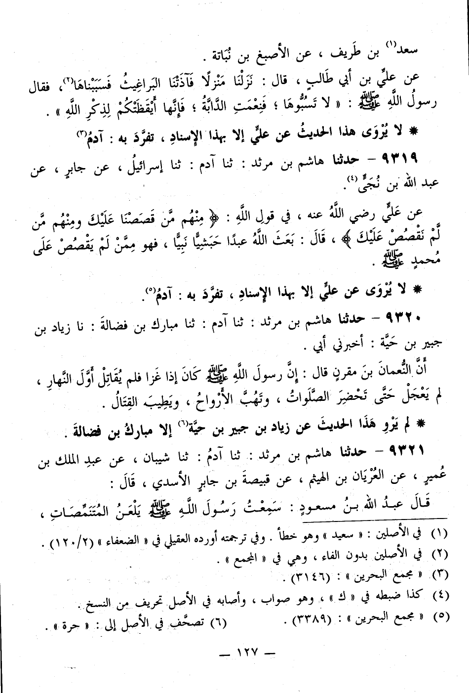 9321 - حَدَّثَنَا هَاشِمُ بْنُ مَرْثَدٍ، ثَنَا آدَمُ، ثَنَا شَيْبَانُ، عَنْ عَبْدِ الْمَلِكِ بْنِ عُمَيْرٍ، عَنِ العُرْيَانِ بْنِ الْهَيْثَمِ، عَنْ قَبِيصَةَ بْنِ جَابِرٍ الْأَسَدِيِّ قَالَ: قَالَ عَبْدُ اللَّهِ بْنُ مَسْعُودٍ: «سَمِعْتُ رَسُولَ اللَّهِ صَلَّى اللهُ عَلَيْهِ وَسَلَّمَ §يَلْعَنُ المُتَنَمِّصَاتِ، -[128]- وَالْمُتَفَلِّجَاتِ، وَالْمُتَوَشِّمَاتِ، وَاللَّاتِي يُغَيِّرْنَ خَلْقَ اللَّهِ»