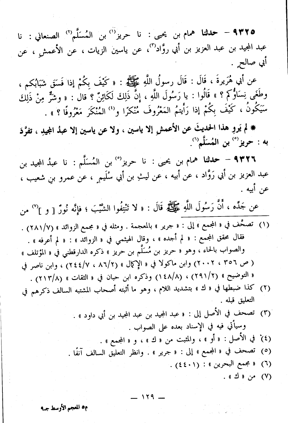 9325 - حَدَّثَنَا هَمَّامُ بْنُ يَحْيَى، نَا حَرِيزُ بْنُ الْمُسْلِمِ الصَّنْعَانِيُّ، نَا عَبْدُ الْمَجِيدِ بْنُ عَبْدِ الْعَزِيزِ بْنِ أَبِي رَوَّادٍ، عَنْ يَاسِينَ الزَّيَّاتِ، عَنِ الْأَعْمَشِ، عَنْ أَبِي صَالِحٍ، عَنْ أَبِي هُرَيْرَةَ، قَالَ: قَالَ رَسُولُ اللَّهِ صَلَّى اللهُ عَلَيْهِ وَسَلَّمَ: «§كَيْفَ بِكُمْ إِذَا فَسَقَ شَبَابُكُمْ، وَطَغَى نِسَاؤُكُمْ؟» قَالُوا: يَا رَسُولَ اللَّهِ، إِنَّ ذَلِكَ لَكَائِنٌ؟ قَالَ: «وَشَرٌّ مِنْ ذَلِكَ سَيَكُونُ، كَيْفَ بِكُمْ إِذَا رَأَيْتُمُ الْمَعْرُوفَ مُنْكَرًا وَالْمُنْكَرَ مَعْرُوفًا؟»
