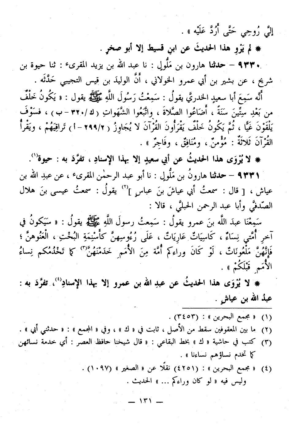9331 - حَدَّثَنَا هَارُونُ بْنُ مَلُّولٍ، نَا أَبُو عَبْدِ الرَّحْمَنِ الْمُقْرِىءُ، عَنْ عَبْدِ اللَّهِ بْنِ عَيَّاشٍ، قَالَ: سَمِعْتُ أَبِي عَيَّاشَ بْنَ عَبَّاسٍ، يَقُولُ: سَمِعْتُ عِيسَى بْنَ هِلَالٍ الصَّدَفِيَّ، وَأَبَا عَبْدِ الرَّحْمَنِ الْحُبُلِيَّ، قَالَا: سَمِعْنَا عَبْدَ اللَّهِ بْنَ عَمْرٍو، يَقُولُ: سَمِعْتُ رَسُولَ اللَّهِ صَلَّى اللهُ عَلَيْهِ وَسَلَّمَ يَقُولُ: «§سَيَكُونُ فِي آخِرِ أُمَّتِي نِسَاءٌ كَاسِيَاتٌ عَارِيَاتٌ، عَلَى رُءُوسِهِنَّ كَأَسْنِمَةِ الْبُخْتِ، الْعَنُوهُنَّ؛ فَإِنَّهُنَّ مَلْعُونَاتٌ، لَوْ كَانَ وَرَاءَكُمْ أُمَّةٌ مِنَ الْأُمَمِ خَدَمْنَهُنَّ كَمَا تَخْدُمُكُمْ نِسَاءُ الْأُمَمِ قَبَلَكُمْ»