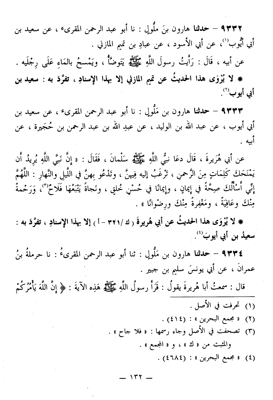 9332 - حَدَّثَنَا هَارُونُ بْنُ مَلُّولٍ، نَا أَبُو عَبْدِ الرَّحْمَنِ الْمُقْرِىءُ، عَنْ سَعِيدِ بْنِ أَبِي أَيُّوبَ، عَنْ أَبِي الْأَسْوَدِ، عَنْ عَبَّادِ بْنِ تَمِيمٍ الْمَازِنِيِّ، عَنْ أَبِيهِ، قَالَ: «رَأَيْتُ رَسُولَ اللَّهِ صَلَّى اللهُ عَلَيْهِ وَسَلَّمَ §يَتَوَضَّأُ، وَيَمْسَحُ بِالْمَاءِ عَلَى رِجْلَيْهِ»