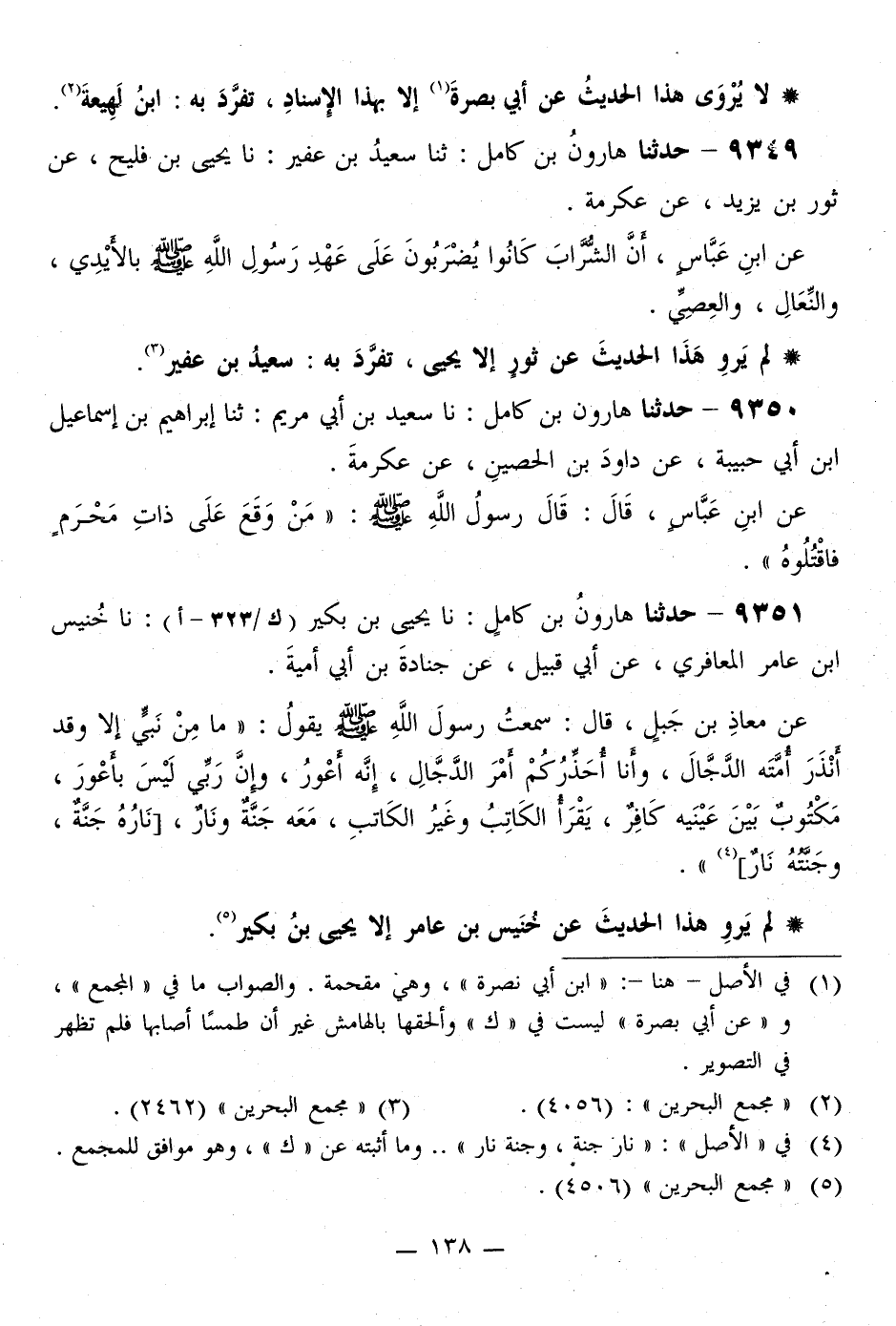 9351 - حَدَّثَنَا هَارُونُ بْنُ كَامِلٍ، نَا يَحْيَى بْنُ بُكَيْرٍ، نَا خُنَيْسُ بْنُ عَامِرٍ الْمَعَافِرِيُّ، عَنْ أَبِي قَبِيلٍ، عَنْ جُنَادَةَ بْنِ أَبِي أُمَيَّةَ، عَنْ مُعَاذِ بْنِ جَبَلٍ قَالَ: سَمِعْتُ رَسُولَ اللَّهِ صَلَّى اللهُ عَلَيْهِ وَسَلَّمَ يَقُولُ: «§مَا مِنْ نَبِيٍّ إِلَّا وَقَدْ أَنْذَرَ أُمَّتَهُ الدَّجَّالَ، وَأَنَا أُحَذِّرُكُمْ أَمْرَ الدَّجَّالِ، إِنَّهُ أَعْوَرُ، وَإِنَّ رَبِّي لَيْسَ بِأَعْوَرَ، مَكْتُوبٌ بَيْنَ عَيْنَيْهِ كَافِرٌ، يَقْرَأُ الْكَاتِبُ وَغَيْرُ الْكَاتِبِ، مَعَهُ جَنَّةٌ وَنَارٌ، نَارُهُ جَنَّةٌ وَجَنَّتُهُ نَارٌ»
