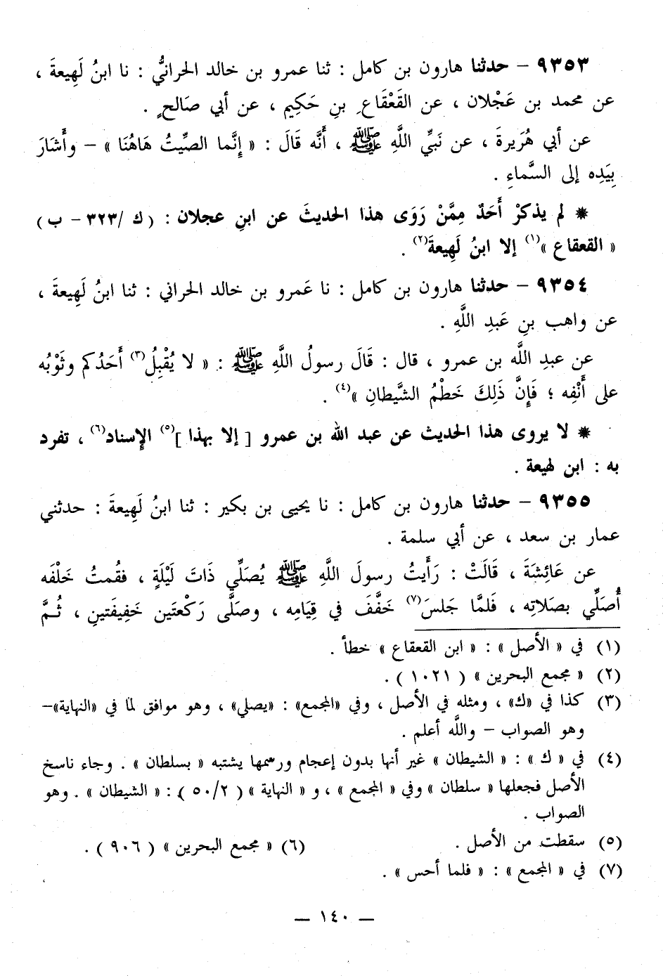 9354 - حَدَّثَنَا هَارُونُ بْنُ كَامِلٍ، نَا عَمْرُو بْنُ خَالِدٍ الْحَرَّانِيُّ، ثَنَا ابْنُ لَهِيعَةَ، عَنْ وَاهِبِ بْنِ عَبْدِ اللَّهِ، عَنْ عَبْدِ اللَّهِ بْنِ عَمْرٍو، قَالَ: قَالَ رَسُولُ اللَّهِ صَلَّى اللهُ عَلَيْهِ وَسَلَّمَ: «§لَا يُقْبِلُ أَحَدُكُمْ وَثَوْبُهُ عَلَى أَنْفِهِ؛ فَإِنَّ ذَلِكَ خَطْمُ الشَّيْطَانِ»