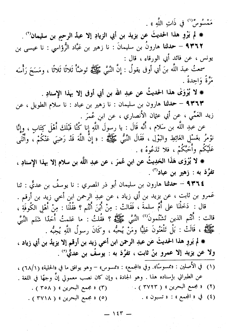 9363 - حَدَّثَنَا هَارُونُ بْنُ سُلَيْمَانَ، نَا زُهَيْرُ بْنُ عَبَّادٍ، نَا سَلَّامُ الطَّوِيلُ، عَنْ زَيْدٍ الْعَمِّيِّ، عَنْ أَبِي عُثْمَانَ الْأَنْصَارِيِّ، عَنِ ابْنِ عُمَرَ، عَنْ عَبْدِ اللَّهِ بْنِ سَلَامٍ، أَنَّهُ قَالَ: يَا رَسُولَ اللَّهِ إِنَّا كُنَّا قَبْلَكَ أَهْلَ كِتَابٍ، وَإِنَّا §نُؤْمَرُ بِغَسْلِ الْغَائِطِ وَالْبَوْلِ، فَقَالَ النَّبِيُّ صَلَّى اللهُ عَلَيْهِ وَسَلَّمَ: «إِنَّ اللَّهَ قَدْ رَضِيَ عَنْكُمْ، وَأَثْنَى عَلَيْكُمْ، وَأَحَبَّكُمْ، فَلَا تَدَعُوهُ»