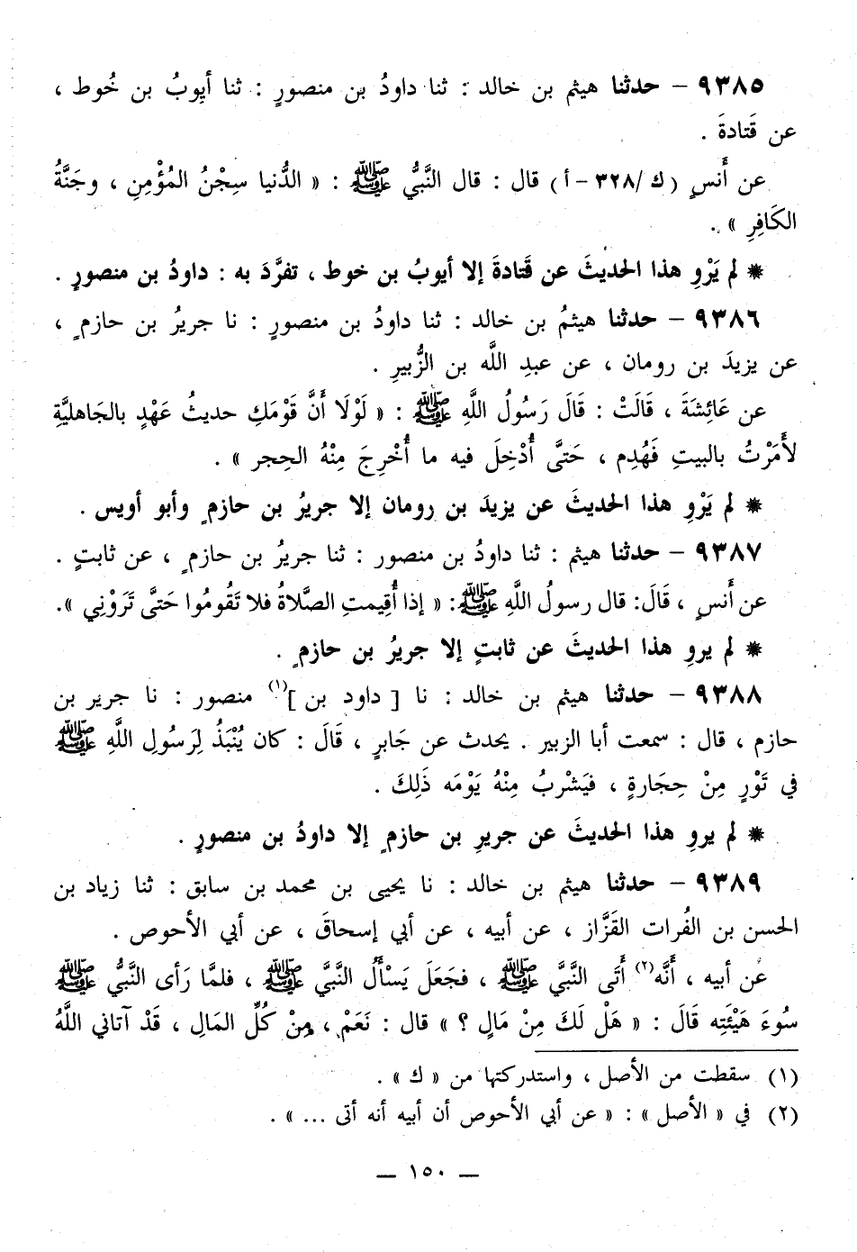 9385 - حَدَّثَنَا هَيْثَمُ بْنُ خَالِدٍ، ثَنَا دَاوُدُ بْنُ مَنْصُورٍ، ثَنَا أَيُّوبُ بْنُ خُوطٍ، عَنْ قَتَادَةَ، عَنْ أَنَسٍ قَالَ: قَالَ النَّبِيُّ صَلَّى اللهُ عَلَيْهِ وَسَلَّمَ: «§الدُّنْيَا سِجْنُ الْمُؤْمِنِ، وَجَنَّةُ الْكَافِرِ»