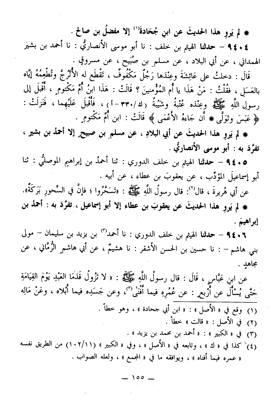 9404 - حَدَّثَنَا الْهَيْثَمُ بْنُ خَلَفٍ، نَا أَبُو مُوسَى الْأَنْصَارِيُّ، نَا أَحْمَدُ بْنُ بَشِيرٍ الْهَمْدَانِيُّ، عَنْ أَبِي الْبِلَادِ، عَنْ مُسْلِمِ بْنِ صُبَيْحٍ، عَنْ مَسْرُوقٍ، قَالَ: دَخَلْتُ عَلَى عَائِشَةَ وَعِنْدَهُا رَجُلٌ مَكْفُوفٌ، تَقْطَعُ لَهُ الْأُتْرُجَّ وَتُطْعُمُهُ إِيَّاهُ بِالْعَسَلِ، فَقُلْتُ: مَنْ هَذَا يَا أُمَّ الْمُؤْمِنِينَ؟ قَالَتْ: هَذَا ابْنُ أُمِّ مَكْتُومٍ، «أَقْبَلَ إِلَى رَسُولِ اللَّهِ صَلَّى اللهُ عَلَيْهِ وَسَلَّمَ وَعِنْدَهُ عُتْبَةُ وَشَيْبَةُ، فَأَقْبَلَ عَلَيْهِمَا، فَنَزَلَتْ: {§عَبَسَ وَتَوَلَّى} [عبس: 2] أَنْ جَاءَهُ الْأَعْمَى قَالَتْ: ابْنُ أُمِّ مَكْتُومٍ»