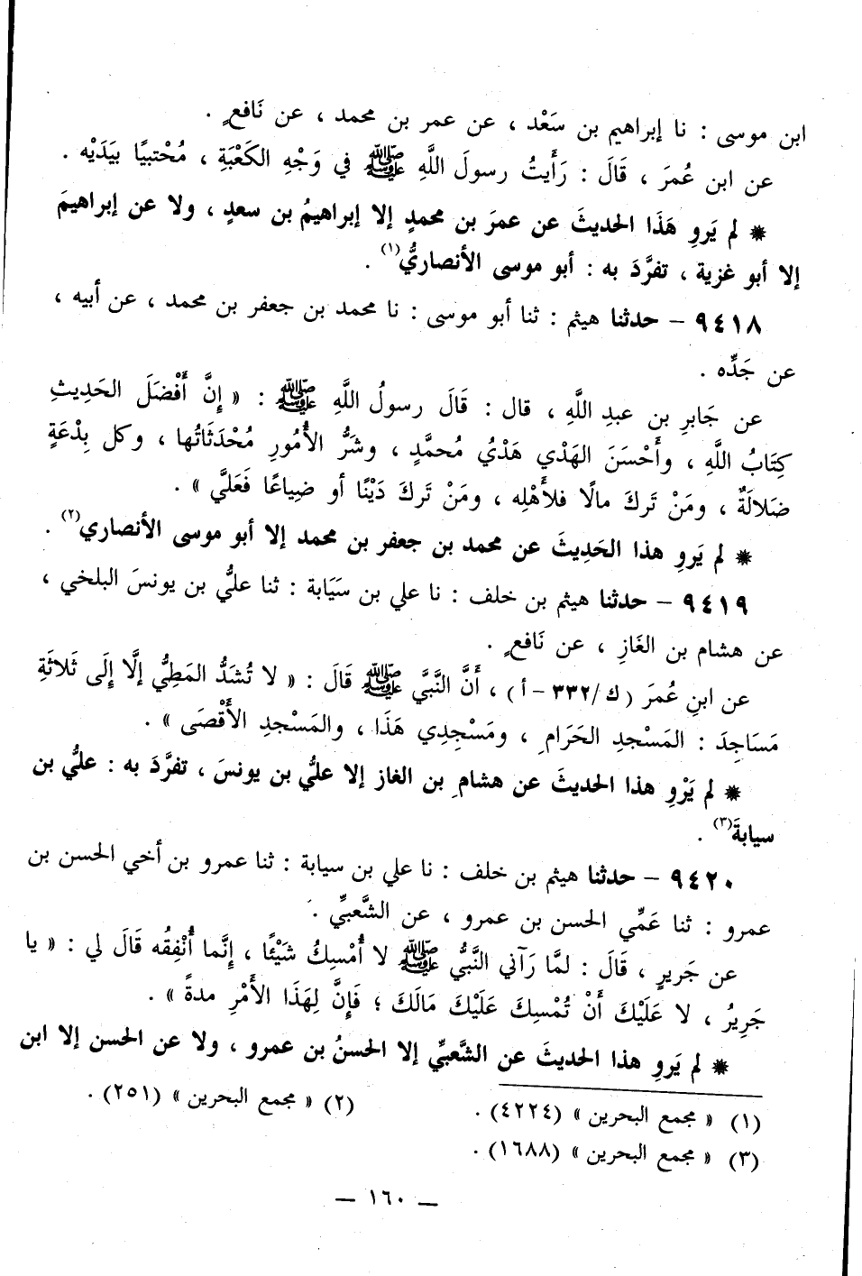 9419 - حَدَّثَنَا هَيْثَمُ بْنُ خَلَفٍ، نَا عَلِيُّ بْنُ سَيَابَةَ، ثَنَا عَلِيُّ بْنُ يُونُسَ الْبَلْخِيُّ، عَنْ هِشَامِ بْنِ الْغَازِ عَنْ نَافِعٍ، عَنِ ابْنِ عُمَرَ، أَنَّ النَّبِيَّ صَلَّى اللهُ عَلَيْهِ وَسَلَّمَ قَالَ: «§لَا تُشَدُّ الْمَطِيُّ إِلَّا إِلَى ثَلَاثَةِ مَسَاجِدَ: الْمَسْجِدِ الْحَرَامِ، وَمَسْجِدِي هَذَا، وَالْمَسْجِدِ الْأَقْصَى»