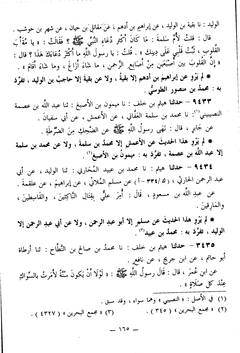 9435 - حَدَّثَنَا هَيْثَمُ بْنُ خَلَفٍ، نَا مُحَمَّدُ بْنُ صَالِحِ بْنِ النَّطَّاحِ، ثَنَا أَرْطَاةُ أَبُو حَاتِمٍ، عَنِ ابْنِ جُرَيْجٍ، عَنْ نَافِعٍ، عَنِ ابْنِ عُمَرَ، قَالَ: قَالَ رَسُولُ اللَّهِ صَلَّى اللهُ عَلَيْهِ وَسَلَّمَ: «§لَوْلَا أَنْ يَكُونَ سُنَّةً لَأَمَرْتُ بِالسِّوَاكِ عِنْدَ كُلِّ صَلَاةٍ» -[166]- لَمْ يَرْوِ هَذَا الْحَدِيثَ عَنِ ابْنِ جُرَيْجٍ إِلَّا أَرْطَاةُ أَبُو حَاتِمٍ، تَفَرَّدَ بِهِ مُحَمَّدُ بْنُ صَالِحٍ