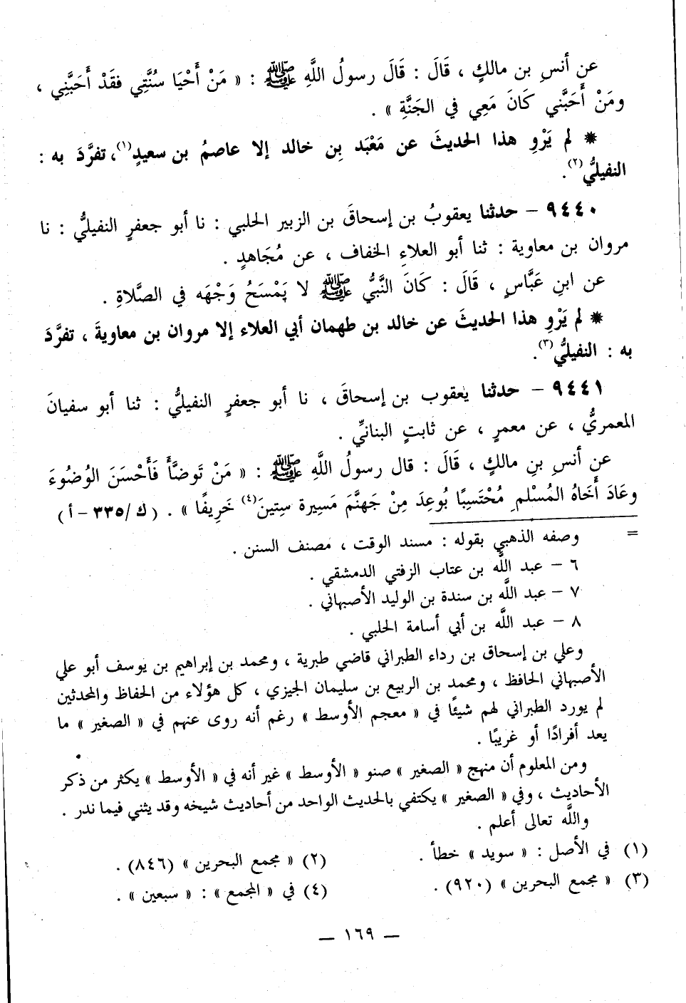 9440 - حَدَّثَنَا يَعْقُوبُ بْنُ إِسْحَاقَ بْنِ الزُّبَيْرِ الْحَلَبِيُّ، نَا أَبُو جَعْفَرٍ النُّفَيْلِيُّ، نَا مَرْوَانُ بْنُ مُعَاوِيَةَ، ثَنَا أَبُو الْعَلَاءِ الْخِفَافُ، عَنْ مُجَاهِدٍ، عَنِ ابْنِ عَبَّاسٍ، قَالَ: «كَانَ النَّبِيُّ صَلَّى اللهُ عَلَيْهِ وَسَلَّمَ §لَا يَمْسَحُ وَجْهَهُ فِي الصَّلَاةِ»