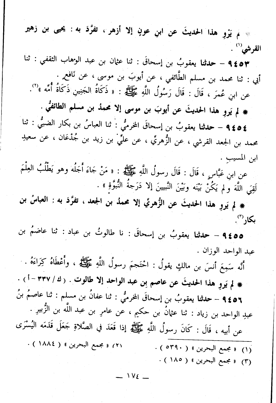 9454 - حَدَّثَنَا يَعْقُوبُ بْنُ إِسْحَاقَ الْمَخْرَمِيُّ، ثَنَا الْعَبَّاسُ بْنُ بَكَّارٍ الضَّبِّيُّ، ثَنَا مُحَمَّدُ بْنُ الْجَعْدِ الْقُرَشِيُّ، عَنِ الزُّهْرِيِّ، عَنْ عَلِيِّ بْنِ زَيْدِ بْنِ جُدْعَانَ، عَنْ سَعِيدِ بْنِ الْمُسَيِّبِ، عَنِ ابْنِ عَبَّاسٍ، قَالَ: قَالَ رَسُولُ اللَّهِ صَلَّى اللهُ عَلَيْهِ وَسَلَّمَ: «§مَنْ جَاءَ أَجَّلُهُ وَهُوَ يَطْلُبُ الْعِلْمَ لَقِيَ اللَّهَ وَلَمْ يَكُنْ بَيْنَهُ وَبَيْنَ النَّبِيِّينَ إِلَّا دَرَجَةُ النُّبُوَّةِ»