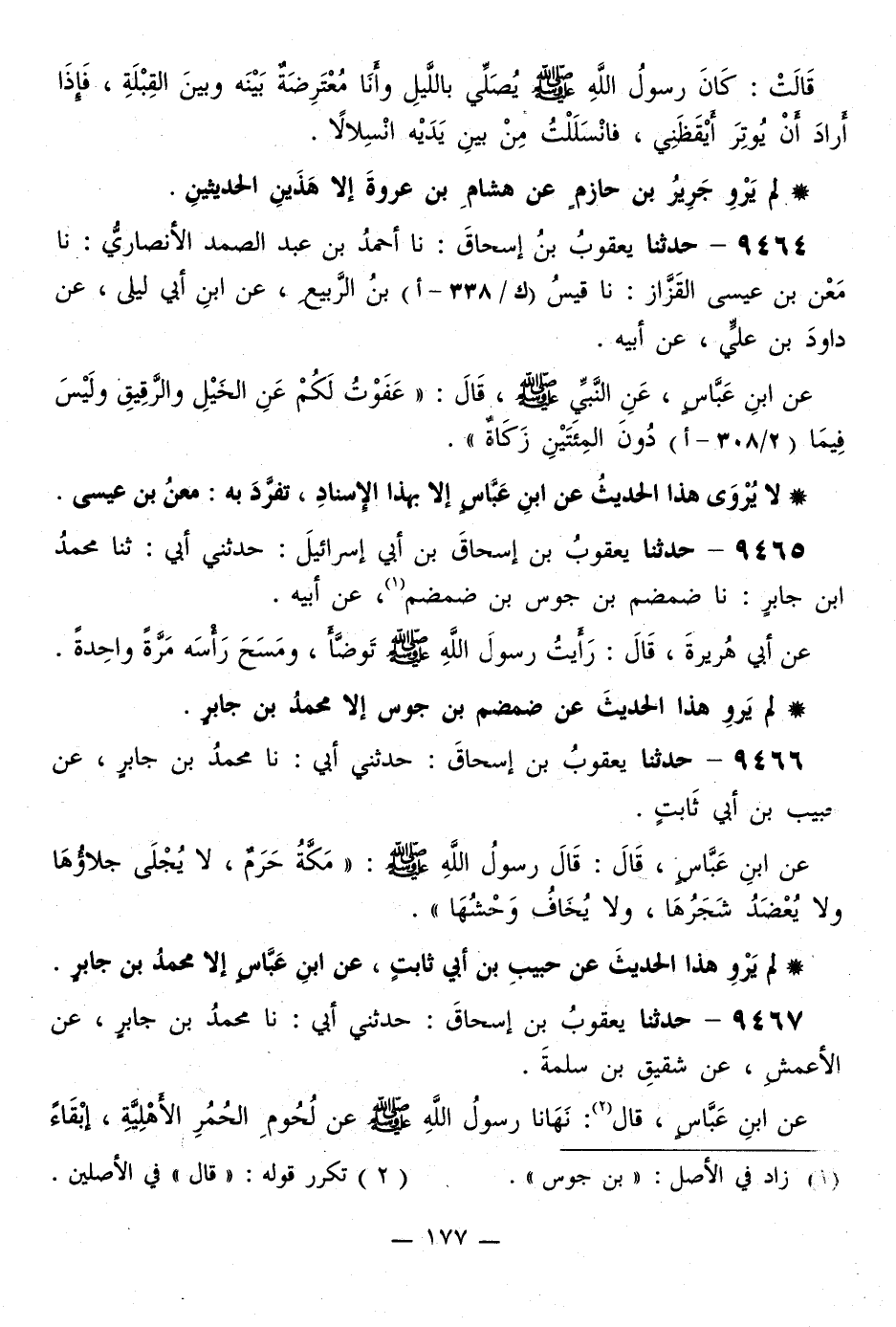 9466 - حَدَّثَنَا يَعْقُوبُ بْنُ إِسْحَاقَ، حَدَّثَنِي أَبِي، نَا مُحَمَّدُ بْنُ جَابِرٍ، عَنْ حَبِيبِ بْنِ أَبِي ثَابِتٍ، عَنِ ابْنِ عَبَّاسٍ، قَالَ: قَالَ رَسُولُ اللَّهِ صَلَّى اللهُ عَلَيْهِ وَسَلَّمَ: «§مَكَّةُ حَرَمٌ، لَا يُجْلَى جَلَاؤُهَا، وَلَا يُعْضَدُ شَجَرُهَا، وَلَا يُخَافُ وَحْشُهَا»