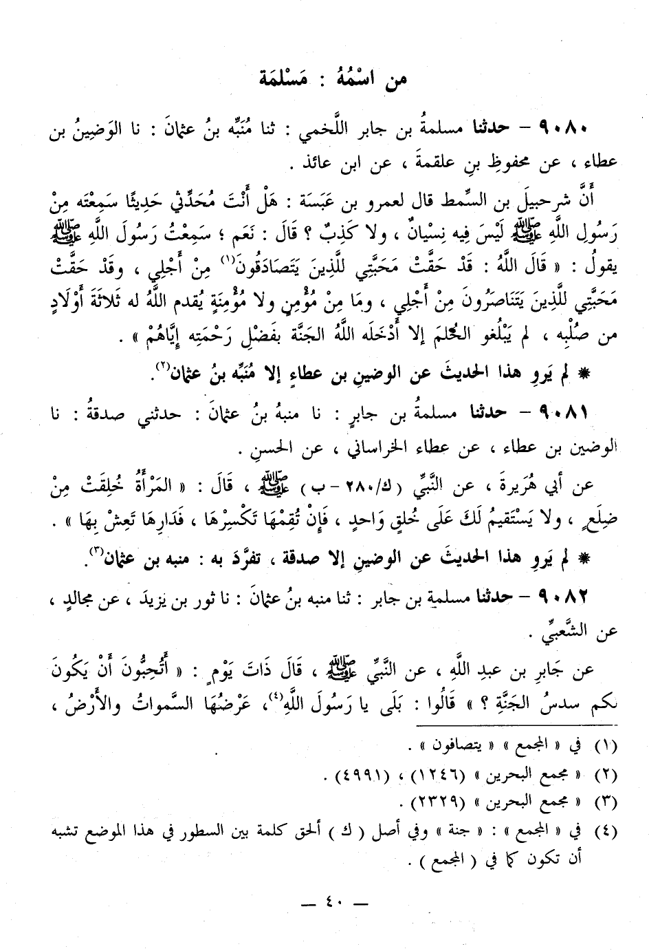 9080 - حَدَّثَنَا مَسْلَمَةُ بْنُ جَابِرٍ اللَّخْمِيُّ، ثَنَا مُنَبِّهُ بْنُ عُثْمَانَ، نَا الْوَضِينُ بْنُ عَطَاءٍ، عَنْ مَحْفُوظِ بْنِ عَلْقَمَةَ، عَنِ ابْنِ عَائِذٍ، أَنَّ شُرَحْبِيلَ بْنَ السِّمْطِ، قَالَ لِعَمْرِو بْنِ عَبَسَةَ: هَلْ أَنْتَ مُحَدِّثِي حَدِيثًا سَمِعْتَهُ مِنْ رَسُولِ اللَّهِ صَلَّى اللهُ عَلَيْهِ وَسَلَّمَ لَيْسَ فِيهِ نِسْيَانٌ، وَلَا كَذِبٌ؟ قَالَ: نَعَمْ؛ سَمِعْتُ رَسُولَ اللَّهِ صَلَّى اللهُ عَلَيْهِ وَسَلَّمَ يَقُولُ: «قَالَ اللَّهُ: §قَدْ حَقَّتْ مَحَبَّتِي لِلَّذِينَ يَتَصَادَقُونَ مِنْ أَجْلِي، وَقَدْ حَقَّتْ مَحَبَّتِي لِلَّذِينَ يَتَنَاصَرُونَ مِنْ أَجْلِي، وَمَا مِنْ مُؤْمِنٍ وَلَا مُؤْمِنَةٍ يُقَدِّمُ اللَّهُ لَهُ ثَلَاثَةَ أَوْلَادٍ مِنْ صُلْبِهِ، لَمْ يَبْلُغُوا الْحُلُمَ إِلَّا أَدْخَلَهُ اللَّهُ الْجَنَّةَ بِفَضْلِ رَحْمَتِهِ إِيَّاهُمْ»