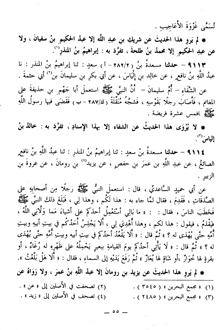 9114 - حَدَّثَنَا مَسْعَدَةُ بْنُ سَعْدٍ، ثَنَا إِبْرَاهِيمُ بْنُ الْمُنْذِرِ، ثَنَا عَبْدُ اللَّهِ بْنُ نَافِعٍ الصَّائِغُ، عَنْ عَبْدِ اللَّهِ بْنِ عُمَرَ بْنِ حَفْصٍ، عَنْ يَزِيدَ بْنِ رُومَانَ، عَنْ عُرْوَةَ بْنِ الزُّبَيْرِ، عَنْ أَبِي حُمَيْدٍ السَّاعِدِيِّ، قَالَ: اسْتَعْمَلَ النَّبِيُّ صَلَّى اللهُ عَلَيْهِ وَسَلَّمَ رَجُلًا مِنْ أَصْحَابِهِ عَلَى الصَّدَقَاتِ، فَقَدِمَ فَقَالَ لَمَّا جَاءَ بِهِ: هَذَا لَكُمْ، وَهَذَا لِي، فَبَلَغَ ذَلِكَ النَّبِيَّ صَلَّى اللهُ عَلَيْهِ وَسَلَّمَ فَخَطَبَ النَّاسَ، فَقَالَ: «مَا بَالِي أَسْتَعْمِلُ أَحَدَكُمْ عَلَى أَشْيَاءٍ مِمَّا وَلَّانِي اللَّهُ، فَيَقْدُمُ، فَيَقُولُ: هَذَا لَكُمْ، وَهَذَا أُهْدِيَ لِي، أَلَا يَجْلِسُ أَحَدُكُمْ فِي بَيْتِ أَبِيهِ وَبَيْتِ أُمِّهِ حَتَّى يُهْدَى لَهُ؟» ثُمَّ قَالَ: «أَلَا يَقْعُدُ أَحَدُكُمْ فِي بَيْتِ أَبِيهِ وَبَيْتِ أُمِّهِ حَتَّى يُهْدَى لَهُ؟» ثُمَّ قَالَ: «§لَا يَأْتِي أَحَدُكُمْ يَوْمَ الْقِيَامَةِ بِبَعِيرٍ يَحْمِلُهُ عَلَى ظَهْرِهِ لَهُ رُغَاءٌ، أَوْ بَقَرَةٌ لَهَا خُوَارٌ أَوْ شَاةٌ لَهَا يُعَارٌ» ثُمَّ رَفَعَ يَدَيْهِ إِلَى السَّمَاءِ، فَقَالَ: «أَلَا هَلْ بَلَّغْتُ»