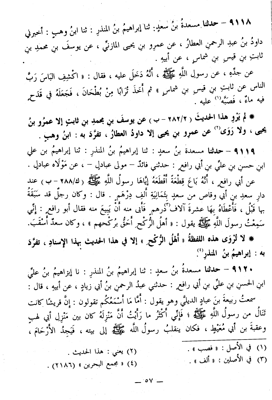 9119 - حَدَّثَنَا مَسْعَدَةُ بْنُ سَعْدٍ، ثَنَا إِبْرَاهِيمُ بْنُ الْمُنْذِرِ، ثَنَا إِبْرَاهِيمُ بْنُ عَلِيِّ بْنِ حَسَنِ بْنِ عَلِيِّ بْنِ أَبِي رَافِعٍ، حَدَّثَنِي فَائِدٌ - مَوْلَى عَبَادِلَ -، عَنْ مَوْلَاهُ عَبَادِلَ عَنْ أَبِي رَافِعٍ، أَنَّهُ بَاعَ قِطْعَةً أَقْطَعَهُ إِيَّاهَا رَسُولُ اللَّهِ صَلَّى اللهُ عَلَيْهِ وَسَلَّمَ عَنْدَ دَارِ سَعْدِ بْنِ أَبِي وَقَّاصٍ مِنْ سَعْدٍ بِثَمَانِيَةِ أَلْفِ دِرْهَمٍ، قَالَ: وَكَانَ رَجُلٌ قَدْ سَبَقَهُ بِهَا قَبْلُ، فَأَعْطَاهُ عَشْرَةَ آلَافِ دِرْهَمٍ فَأَبَى مِنْهُ أَنْ يَبِيعَ مِنْهُ، فَقَالَ أَبُو رَافِعٍ: إِنِّي سَمِعْتُ رَسُولَ اللَّهِ صَلَّى اللهُ عَلَيْهِ وَسَلَّمَ يَقُولُ: «§أَهْلُ الرُّكْحِ أَحَقُّ بِرُكْحِهِمْ» ، وَكَانَ سَعْدٌ أَسْقَبَ لَا تُرْوَى هَذِهِ اللَّفْظَةُ «أَهْلُ الرُّكْحِ» إِلَّا فِي هَذَا الْحَدِيثِ بِهَذَا الْإِسْنَادِ، تَفَرَّدَ بِهِ إِبْرَاهِيمُ بْنُ الْمُنْذِرِ