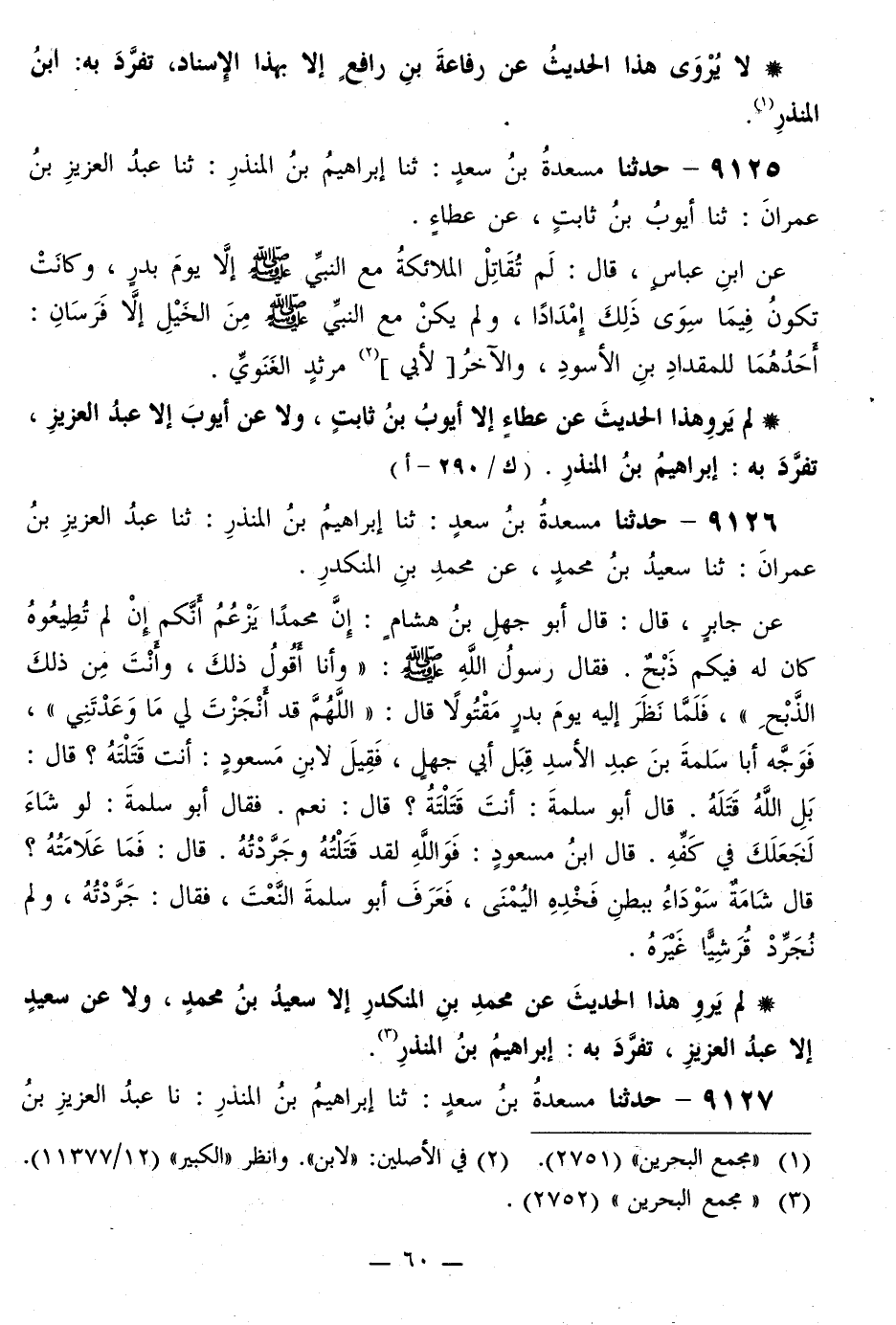 9126 - حَدَّثَنَا مَسْعَدَةُ بْنُ سَعْدٍ، ثَنَا إِبْرَاهِيمُ بْنُ الْمُنْذِرِ، ثَنَا عَبْدُ الْعَزِيزِ بْنُ عِمْرَانَ، ثَنَا سَعِيدُ بْنُ مُحَمَّدٍ، عَنْ مُحَمَّدِ بْنِ الْمُنْكَدِرِ، عَنْ جَابِرٍ، قَالَ: قَالَ أَبُو جَهْلِ بْنُ هِشَامٍ: إِنَّ مُحَمَّدًا يَزْعُمُ أَنَّكُمْ إِنْ لَمْ تُطِيعُوهُ كَانَ لَهُ فِيكُمْ ذَبْحٌ، فَقَالَ رَسُولُ اللَّهِ صَلَّى اللهُ عَلَيْهِ وَسَلَّمَ: «وَأَنَا أَقُولُ ذَلِكَ، وَأَنْتَ مِنْ ذَلِكَ الذَّبْحِ» فَلَمَّا نَظَرَ إِلَيْهِ يَوْمَ بَدْرٍ مَقْتُولًا قَالَ: «§اللَّهُمَّ قَدْ أَنْجَزْتَ لِي مَا وَعَدْتَنِي» فَوَجَّهَ أَبَا سَلَمَةَ بْنَ عَبْدِ الْأَسْدِ قِبَلَ أَبِي جَهْلٍ، فَقِيلَ لِابْنِ مَسْعُودٍ: أَنْتَ قَتَلْتَهُ؟ قَالَ: «بَلِ اللَّهُ قَتَلَهُ» ، قَالَ أَبُو سَلَمَةَ: أَنْتَ قَتَلْتَهُ؟ قَالَ: «نَعَمْ» ، فَقَالَ أَبُو سَلَمَةَ: لَوْ شَاءَ لَجَعَلَكَ فِي كَفِّهِ، قَالَ ابْنُ مَسْعُودٍ: «فَوَاللَّهِ لَقَدْ قَتَلْتُهُ وَجَرَّدْتُهُ» ، قَالَ: فَمَا عَلَامَتُهُ؟ قَالَ: «شَامَةٌ سَوْدَاءُ بِبَطْنِ فَخِذِهِ الْيُمْنَى» ، فَعَرَفَ أَبُو سَلَمَةَ النَّعْتَ، فَقَالَ: «جَرَّدْتُهُ، وَلَمْ نُجَرِّدْ قُرَشِيًّا غَيْرَهُ»