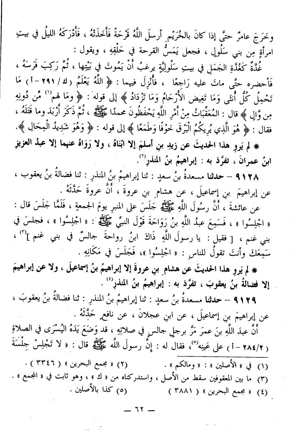 9128 - حَدَّثَنَا مَسْعَدَةُ بْنُ سَعْدٍ، ثَنَا إِبْرَاهِيمُ بْنُ الْمُنْذِرِ، ثَنَا فَضَالَةُ بْنُ يَعْقُوبَ، عَنْ إِبْرَاهِيمَ بْنِ إِسْمَاعِيلَ، عَنْ هِشَامِ بْنِ عُرْوَةَ، أَنَّ عُرْوَةَ، حَدَّثَهُ، عَنْ عَائِشَةَ، أَنَّ رَسُولَ اللَّهِ صَلَّى اللهُ عَلَيْهِ وَسَلَّمَ جَلَسَ عَلَى الْمِنْبَرِ يَوْمَ الْجُمُعَةِ، فَلَمَّا جَلَسَ قَالَ: «§اجْلِسُوا» ، فَسَمِعَ عَبْدُ اللَّهِ بْنُ رَوَاحَةَ قَوْلَ النَّبِيِّ صَلَّى اللهُ عَلَيْهِ وَسَلَّمَ: «اجْلِسُوا» ، فَجَلَسَ فِي بَنِي غَنَمٍ، فَقِيلَ: يَا رَسُولَ اللَّهِ ذَاكَ ابْنُ رَوَاحَةَ جَالِسٌ فِي بَنِي غَنَمٍ، سَمِعَكَ وَأَنْتَ تَقُولُ لِلنَاسِ: «اجْلِسُوا» ، فَجَلَسَ فِي مَكَانِهِ لَمْ يَرْوِ هَذَا الْحَدِيثَ عَنْ هِشَامِ بْنِ عُرْوَةَ إِلَّا إِبْرَاهِيمُ بْنُ إِسْمَاعِيلَ، وَلَا عَنْ إِبْرَاهِيمَ إِلَّا فَضَالَةُ بْنُ يَعْقُوبَ، تَفَرَّدَ بِهِ إِبْرَاهِيمُ بْنُ الْمُنْذِرِ