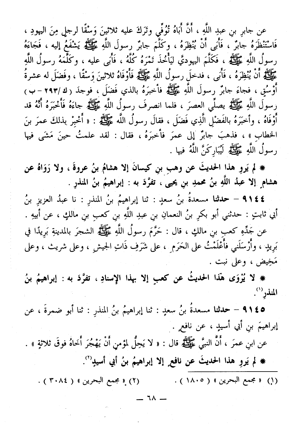 9145 - حَدَّثَنَا مَسْعَدَةُ بْنُ سَعْدٍ، ثَنَا إِبْرَاهِيمُ بْنُ الْمُنْذِرِ، ثَنَا أَبُو ضَمْرَةَ، عَنْ إِبْرَاهِيمَ بْنِ أَبِي أُسَيْدٍ، عَنْ نَافِعٍ، عَنِ ابْنِ عُمَرَ، أَنَّ النَّبِيَّ صَلَّى اللهُ عَلَيْهِ وَسَلَّمَ، قَالَ: «§لَا يَحِلُّ لِمُؤْمِنٍ أَنْ يَهْجُرَ أَخَاهُ فَوْقَ ثَلَاثَةٍ»