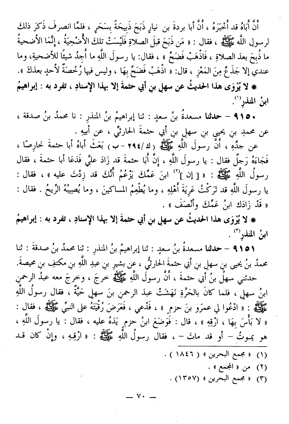 9151 - حَدَّثَنَا مَسْعَدَةُ بْنُ سَعْدٍ، ثَنَا إِبْرَاهِيمُ بْنُ الْمُنْذِرِ، ثَنَا مُحَمَّدُ بْنُ صَدَقَةَ، ثَنَا مُحَمَّدُ بْنُ يَحْيَى بْنِ سَهْلِ بْنِ أَبِي حَثْمَةَ الْحَارِثِيُّ، عَنْ بَشِيرِ بْنِ عَبْدِ اللَّهِ بْنِ مِكْتَفِ بْنِ مُحَيِّصَةَ، حَدَّثَنِي سَهْلُ بْنُ أَبِي حَثْمَةَ، أَنَّ رَسُولَ اللَّهِ صَلَّى اللهُ عَلَيْهِ وَسَلَّمَ خَرَجَ، وَخَرَجَ مَعَهُ عَبْدُ الرَّحْمَنِ بْنُ سَهْلٍ، فَلَمَّا كَانَ بِالْحَرَّةِ نَهَشَتْ عَبْدَ الرَّحْمَنِ بْنَ سَهْلٍ حَيَّةٌ، فَقَالَ رَسُولُ اللَّهِ صَلَّى اللهُ عَلَيْهِ وَسَلَّمَ: «ادْعُوا لِي عَمْرَو بْنَ حَزْمٍ» ، فَدُعِيَ، فَعَرَضَ رُقْيَتَهُ عَلَى النَّبِيِّ صَلَّى اللهُ عَلَيْهِ وَسَلَّمَ، فَقَالَ: «لَا بَأْسَ بِهَا، ارْقِهِ» ، قَالَ: فَوَضَعَ ابْنُ حَزْمٍ يَدَهُ عَلَيْهِ، فَقَالَ: يَا رَسُولَ اللَّهِ، هُوَ يَمُوتُ - أَوْ قَدْ مَاتَ -، فَقَالَ رَسُولُ اللَّهِ صَلَّى اللهُ عَلَيْهِ وَسَلَّمَ: «§ارْقِهِ، وَإِنْ كَانَ قَدْ -[71]- يَمُوتُ» - أَوْ «قَدْ مَاتَ» -، فَرَقَاهُ، فَصَحَّ عَبْدُ الرَّحْمَنِ، وَانْطَلَقَ لَا يُرْوَى هَذَا الْحَدِيثُ عَنْ سَهْلٍ إِلَّا بِهَذَا الْإِسْنَادِ، تَفَرَّدَ بِهِ إِبْرَاهِيمُ بْنُ الْمُنْذِرِ