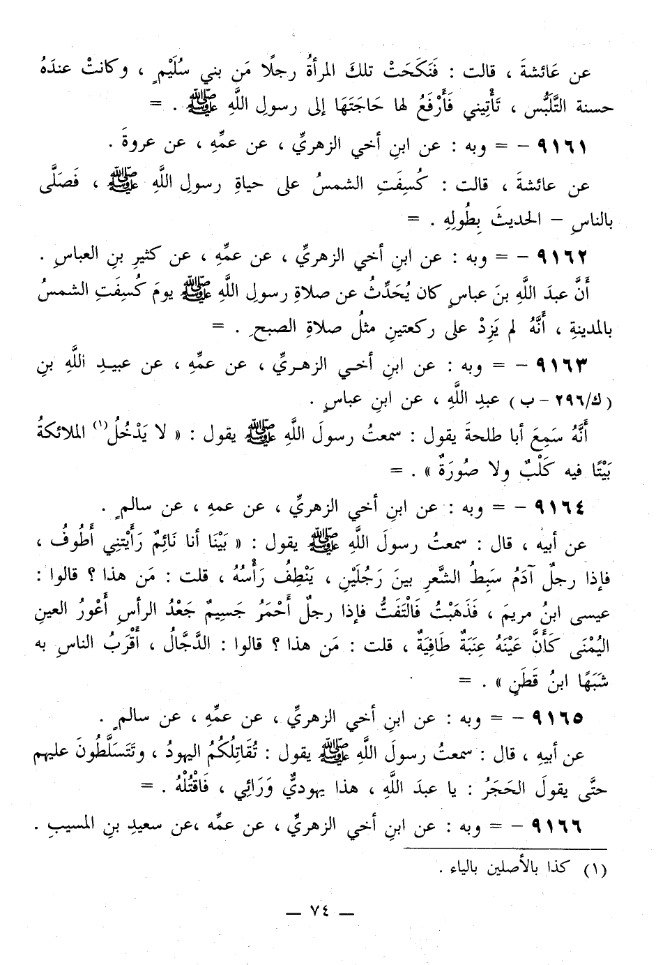 9161 - وَبِهِ، عَنِ ابْنِ أَخِي الزُّهْرِيِّ، عَنْ عَمِّهِ، عَنْ عُرْوَةَ، عَنْ عَائِشَةَ، قَالَتْ: «§كَسَفَتِ الشَّمْسُ عَلَى حَيَاةِ رَسُولِ اللَّهِ صَلَّى اللهُ عَلَيْهِ وَسَلَّمَ، فَصَلَّى بِالنَّاسِ» - الْحَدِيثَ بِطُولِهِ