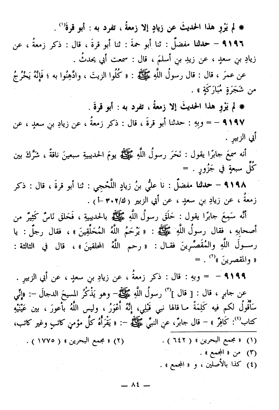 9199 - وَبِهِ قَالَ: ذَكَرَ زَمْعَةُ، عَنْ زِيَادِ بْنِ سَعْدٍ، عَنْ أَبِي الزُّبَيْرِ، عَنْ جَابِرٍ، قَالَ: قَالَ رَسُولُ اللَّهِ صَلَّى اللهُ عَلَيْهِ وَسَلَّمَ وَهُوَ يَذْكُرُ الْمَسِيحَ الدَّجَّالَ: «إِنِّي سَأَقُولُ لَكُمْ فِيهِ كَلِمَةً مَا قَالَهَا نَبِيٌّ قَبْلِي: §إِنَّهُ أَعْوَرٌ، وَلَيْسَ اللَّهُ بِأَعْوَرَ، بَيْنَ عَيْنَيْهِ كِتَابٌ: كَافِرٌ» - قَالَ جَابِرٌ، عَنِ النَّبِيِّ صَلَّى اللهُ عَلَيْهِ وَسَلَّمَ -: «يَقْرَأُهُ كُلُّ مُؤْمِنٍ كَاتِبٍ وَغَيْرِ كَاتِبٍ، -[85]- يَسِيحُ فِي الْأَرْضِ أَرْبَعِينَ يَوْمًا، يَرِدُ كُلَّ بَلَدٍ غَيْرَ هَاتَيْنِ: الْمَدِينَةِ وَمَكَّةَ، حَرَّمَهُمَا اللَّهُ عَلَيْهِ، يَوْمٌ مِنْ أَيَّامِهِ كَالسَّنَةِ، وَيَوْمٌ كَالشَّهْرِ، وَيَوْمٌ كَالْجُمُعَةِ، ثُمَّ بَقِيَّةُ أَيَّامِهِ كَأَيَّامِكُمْ هَذِهِ، لَا يَبْقَى إِلَّا أَرْبَعِينَ يَوْمًا»