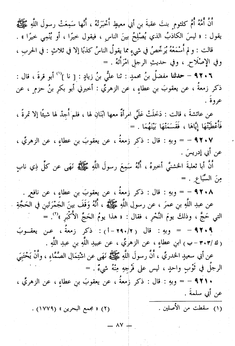 9209 - وَبِهِ، قَالَ: ذَكَرَ زَمْعَةُ، عَنْ يَعْقُوبَ بْنِ عَطَاءٍ، عَنِ الزُّهْرِيِّ، عَنْ عُبَيْدِ اللَّهِ بْنِ عَبْدِ اللَّهِ، عَنْ أَبِي سَعِيدٍ الْخُدْرِيِّ، أَنَّ رَسُولَ اللَّهِ صَلَّى اللهُ عَلَيْهِ وَسَلَّمَ «§نَهَى عَنْ اشْتِمَالِ الصَّمَّاءِ، وَأَنْ يَحْتَبِيَ الرَّجُلُ فِي ثَوْبٍ وَاحِدٍ، لَيْسَ عَلَى فَرْجِهِ مِنْهُ شَيْءٌ»