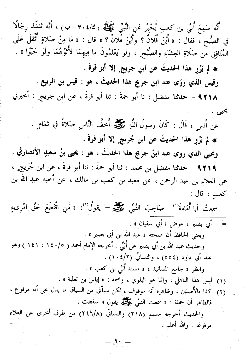 9219 - حَدَّثَنَا مُفَضَّلُ بْنُ مُحَمَّدٍ، ثَنَا أَبُو حُمَةَ، ثَنَا أَبُو قُرَّةَ، عَنِ ابْنِ جُرَيْجٍ، عَنِ الْعَلَاءِ بْنِ عَبْدِ الرَّحْمَنِ، عَنْ مَعْبَدِ بْنِ كَعْبِ بْنِ مَالِكٍ، عَنْ أَخِيهِ عَبْدِ اللَّهِ بْنِ كَعْبٍ، قَالَ: سَمِعْتُ أَبَا أُمَامَةَ، صَاحِبَ النَّبِيِّ صَلَّى اللهُ عَلَيْهِ وَسَلَّمَ يَقُولُ: «§مَنِ اقْتَطَعَ حَقَّ امْرِىءٍ -[91]- مُسْلِمٍ بِيَمِينِهِ فَقَدْ أَوْجَبَ اللَّهُ لَهُ النَّارَ، وَحَرَّمَ عَلَيْهِ الْجَنَّةَ» ، فَقَالَ رَجُلٌ: وَإِنْ شَيْئًا يَسِيرًا يَا رَسُولَ اللَّهِ؟ قَالَ: «وَإِنْ كَانَ قَضِيبًا مِنْ أَرَاكٍ»