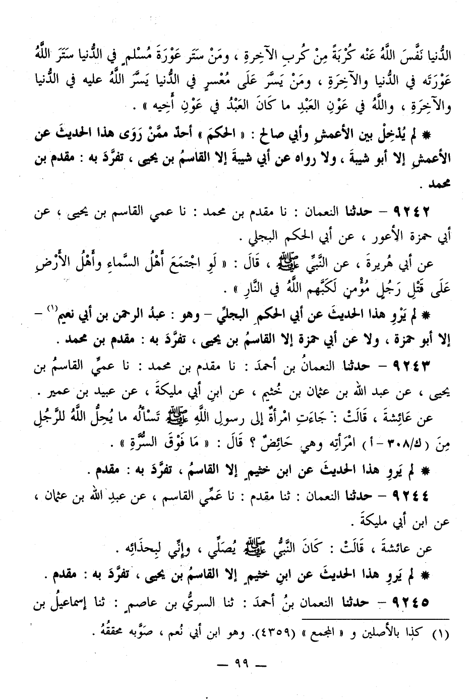9242 - حَدَّثَنَا النُّعْمَانُ، نَا مَقْدَمُ بْنُ مُحَمَّدٍ، نَا عَمِّي الْقَاسِمُ بْنُ يَحْيَى، عَنْ أَبِي حَمْزَةَ الْأَعْوَرِ، عَنْ أَبِي الْحَكَمِ الْبَجَلِيِّ، عَنْ أَبِي هُرَيْرَةَ، عَنِ النَّبِيِّ صَلَّى اللهُ عَلَيْهِ وَسَلَّمَ قَالَ: «§لَوِ اجْتَمَعَ أَهْلُ السَّمَاءِ، وَأَهْلُ الْأَرْضِ عَلَى قَتْلِ رَجُلٍ مُؤْمِنٍ لَكَبَّهُمُ اللَّهُ فِي النَّارِ»