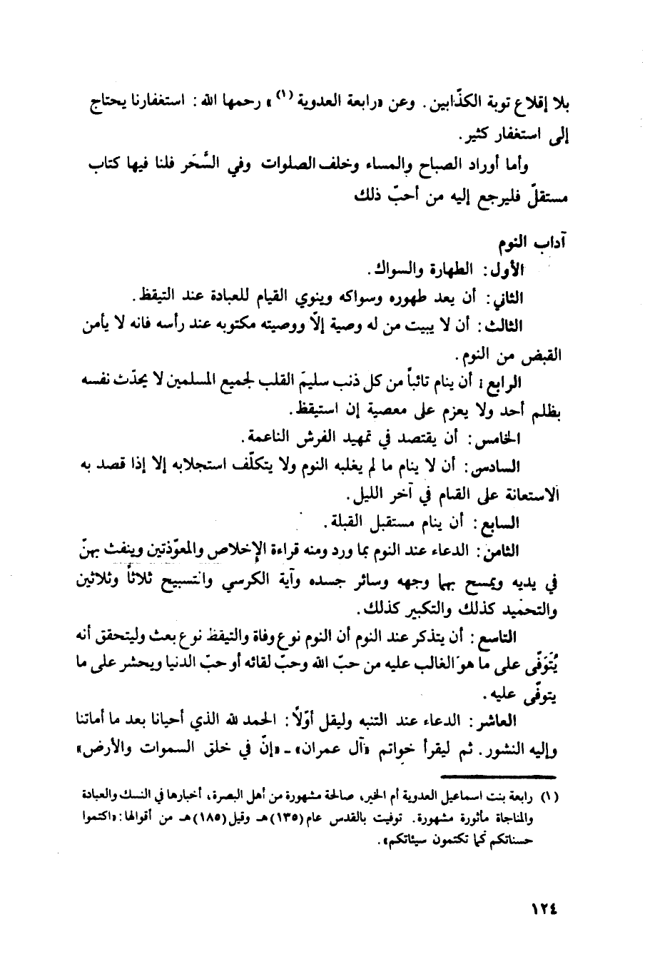 لَا يَنْبَغِي لِلْإِنْسَانِ أَنْ يَشْتَغِلَ بِدَقَائِقِ الْوَرِعِ إِلَّا بِحَضْرَةِ عَالِمٍ مُتْقِنٍ فَإِنَّهُ إِذَا جَاوَزَ مَا رُسِمَ لَهُ وَتَصَرَّفَ بِذِهْنِهِ مِنْ غَيْرِ سَمَاعٍ كَانَ مَا يُفْسِدُهُ أَكْثَرَ مِمَّا يُصْلِحُهُ، وَالْمُتَنَطِّعُونَ هُمُ الَّذِينَ يُخْشَى عَلَيْهِمْ أَنْ يَكُونُوا مِمَّنْ قِيلَ فِيهِمْ: (الَّذِينَ ضَلَّ سَعْيُهُمْ فِي الْحَيَاةِ الدُّنْيَا وَهُمْ يَحْسَبُونَ أَنَّهُمْ يُحْسِنُونَ صُنْعًا) [الْكَهْفِ: 104] وَلِهَذَا قَالَ صَلَّى اللَّهُ عَلَيْهِ وَسَلَّمَ: فَضْلُ الْعَالِمِ عَلَى الْعَابِدِ كَفَضْلِي عَلَى أَدْنَى رَجُلٍ مِنْ أَصْحَابِي. الْبَحْثُ وَالسُّؤَالُ فِي الْحَرَامِ وَالْحَلَالِ:
