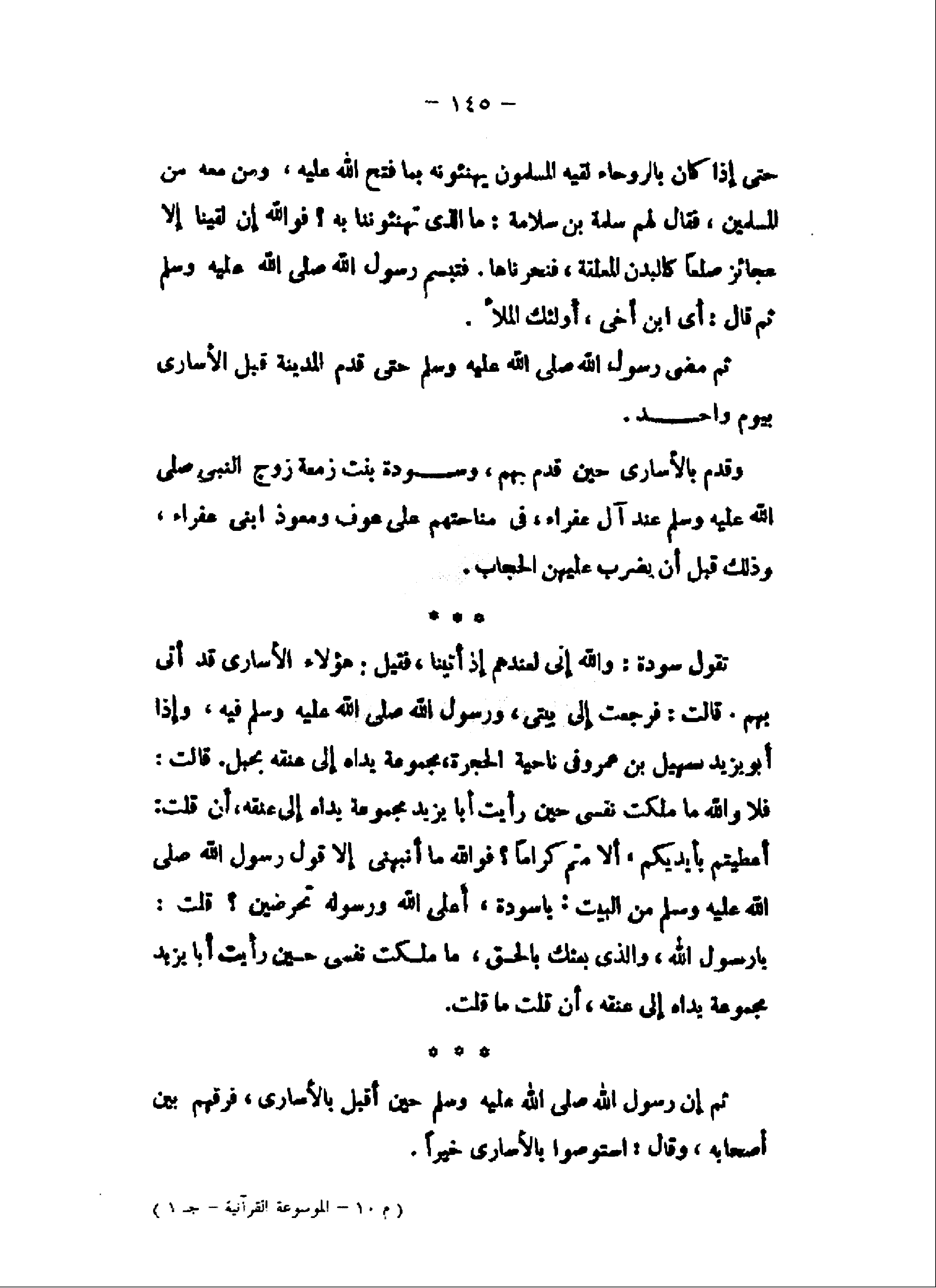 وقدم بالأسارى حين قدم بهم، وسودة بنت زمعة زوج النبى صلى الله عليه وسلم عند آل عفراء، فى مناحتهم على عوف ومعوذ ابنى عفراء، وذلك قبل أن يضرب عليهن الحجاب.