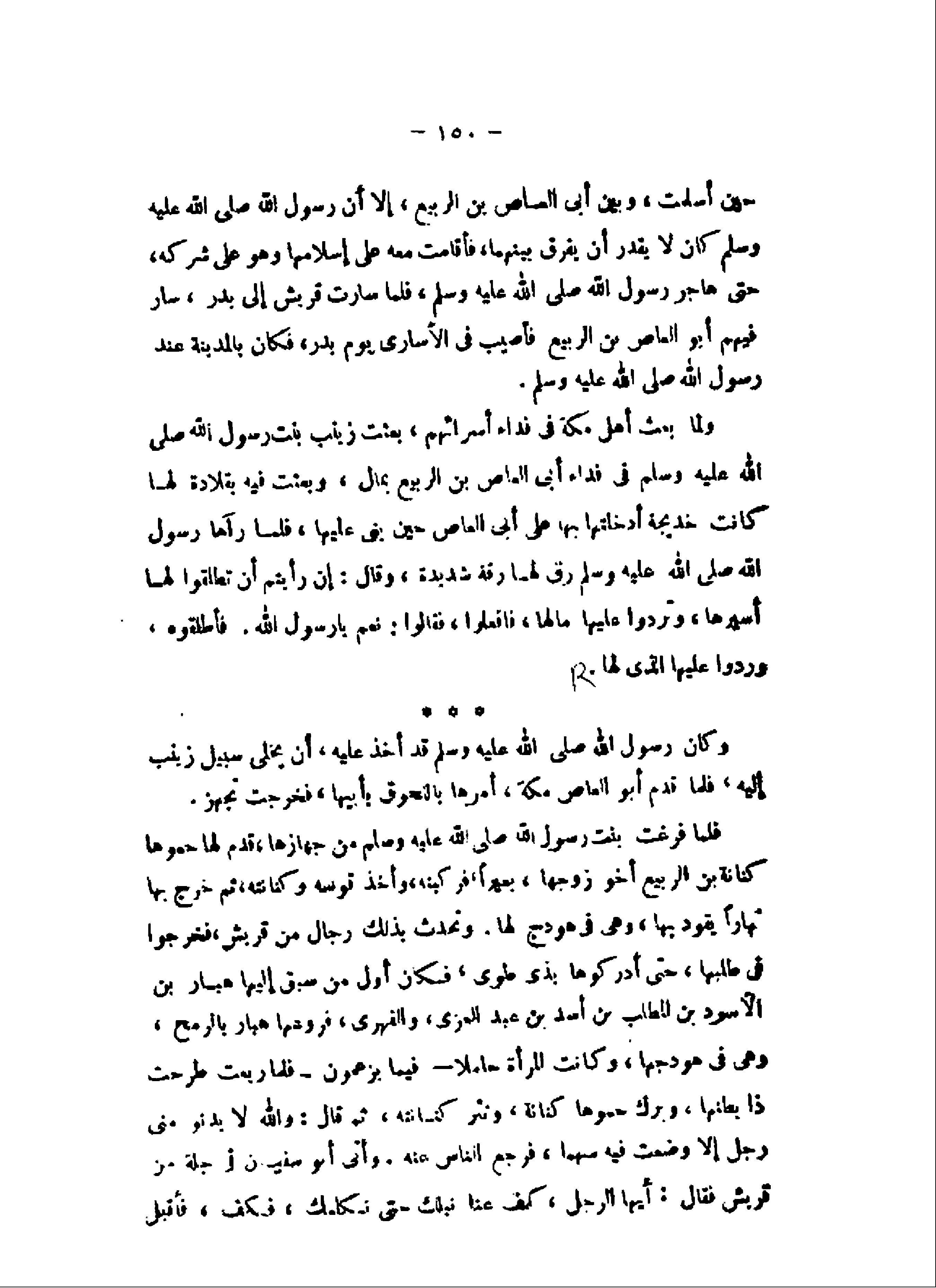 حين أسلمت، وبين أبى العاص بن الربيع، إلا أن رسول الله صلى الله عليه وسلم كان لا يقدر أن يفرق بينهما، فأقامت معه على إسلامها وهو على شركه، حتى هاجر رسول الله صلى الله عليه وسلم، فلما سارت قريش إلى بدر، سار فيهم أبو العاص بن الربيع فأصيب فى الأسارى يوم بدر، فكان بالمدينة عند رسول الله صلى الله عليه وسلم.