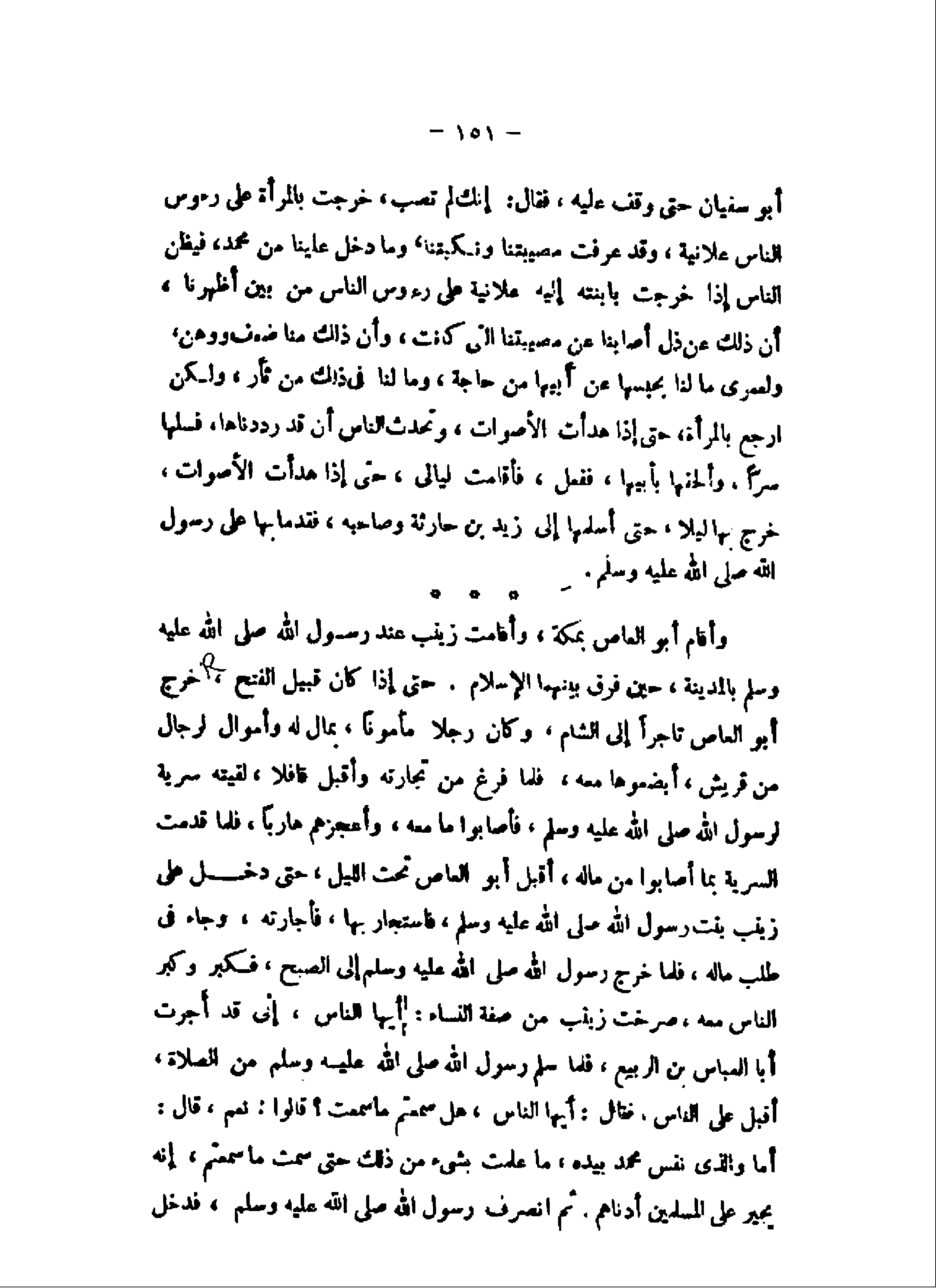 أبو سفيان حتى وقف عليه، فقال: إنك لم تصب، خرجت بالمرأة على رءوس الناس علانية، وقد عرفت مصيبتنا ونكبتنا، وما دخل علينا من محمد، فيظن الناس إذا خرجت بابنته إليه علانية على رءوس الناس من بين أظهرنا، أن ذلك عن ذل أصابنا عن مصيبتنا التى كانت، وأن ذلك منا ضعف ووهن، ولعمرى ما لنا بحبسها عن أبيها من حاجة، وما لنا فى ذلك من ثأر، ولكن ارجع بالمرأة، حتى إذا هدأت الأصوات، وتحدث الناس أن قد رددناها، فسلها سرّا، وألحقها بأبيها، ففعل، فأقامت ليالى، حتى إذا هدأت الأصوات، خرج بها ليلا، حتى أسلمها إلى زيد بن حارثة وصاحبه، فقدما بها على رسول الله صلى الله عليه وسلم.