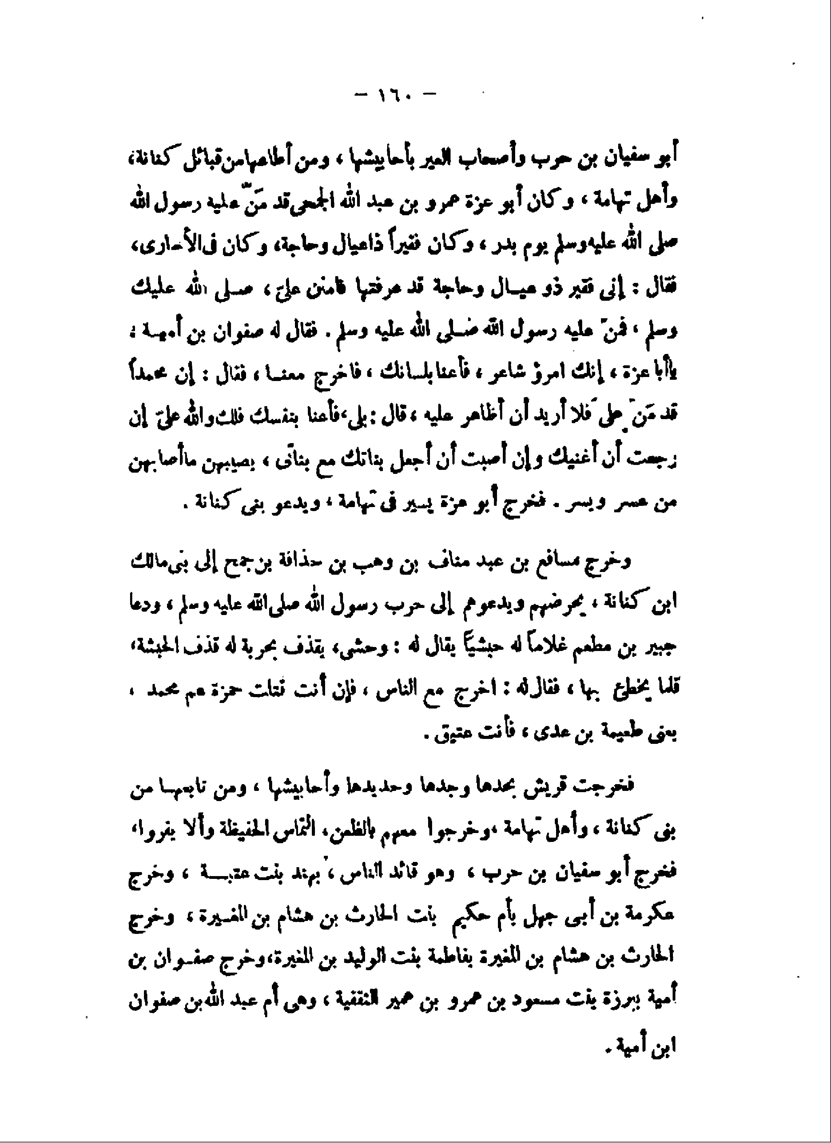 أبو سفيان بن حرب وأصحاب العير بأحابيشها، ومن أطاعها من قبائل كنانة، وأهل تهامة، وكان أبو عزة عمرو بن عبد الله الجمحى قد منّ عليه رسول الله صلى الله عليه وسلم يوم بدر، وكان فقيرا ذاعيال وحاجة، وكان فى الاسارى، فقال: إنى فقير ذو عيال وحاجة قد عرفتها فامنن علىّ، صلى الله عليك وسلم، فمنّ عليه رسول الله صلى الله عليه وسلم. فقال له صفوان بن أمية: