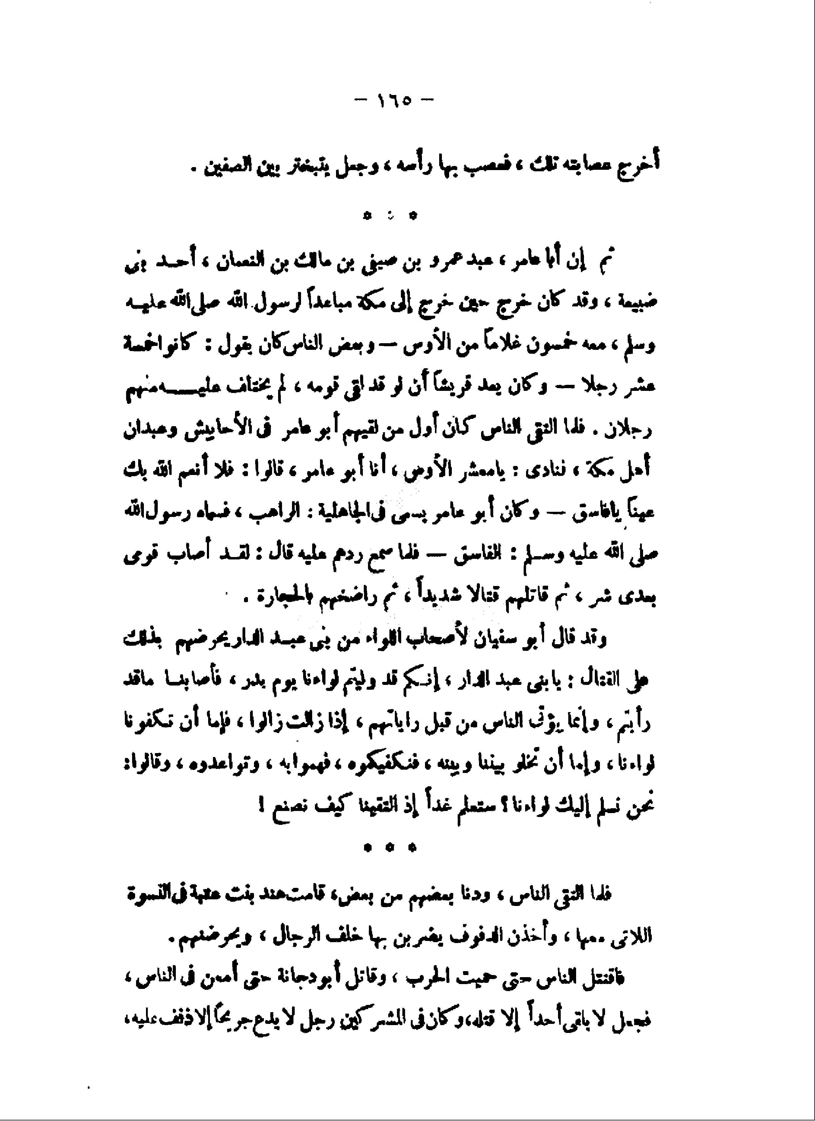 ثم إن أبا عامر، عبد عمرو بن صيفى بن مالك بن النعمان، أحد بنى ضبيعة، وقد كان خرج حين خرج إلى مكة مباعدا لرسول الله صلى الله عليه وسلم، معه خمسون غلاما من الأوس- وبعض الناس كان يقول: كانوا خمسة عشر رجلا- وكان يعد قريشا أن لو قد لقى قومه، لم يختلف عليه منهم رجلان. فلما التقى الناس كان أول من لقيهم أبو عامر فى الأحابيش وعبدان أهل مكة، فنادى: يا معشر الأوس، أنا أبو عامر، قالوا: فلا أنعم الله بك عينا يا فاسق- وكان أبو عامر يسمى فى الجاهلية: الراهب، فسماه رسول الله صلى الله عليه وسلم: الفاسق- فلما سمع ردهم عليه قال: لقد أصاب قومى بعدى شر، ثم قاتلهم قتالا شديدا، ثم راضخهم بالحجارة.