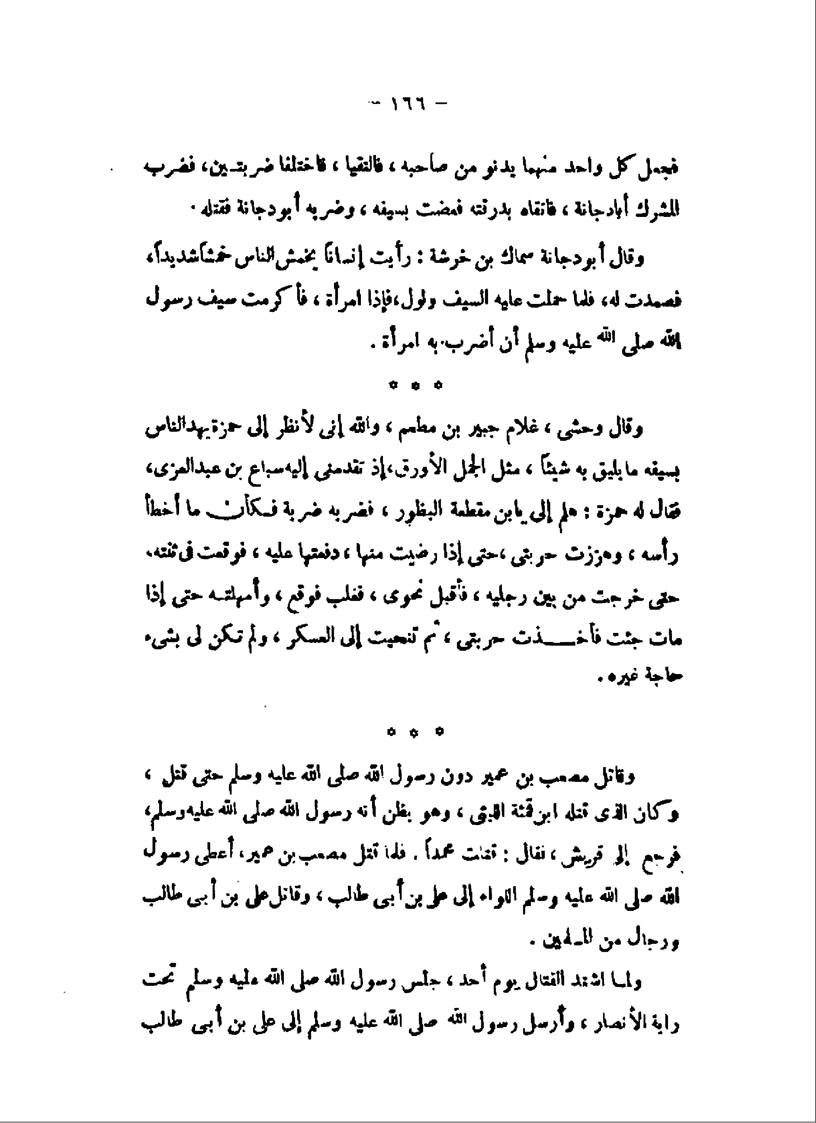 وقال وحشى، غلام جبير بن مطعم، والله إنى لأنظر إلى حمزة يهد الناس بسيفه ما يليق به شيئا، مثل الجمل الأورق، إذ تقدمنى إليه سباع بن عبد العزى، فقال له حمزة: هلم إلى يابن مقطعة البظور، فضربه ضربة فكأن ما أخطأ رأسه، وهززت حربتى، حتى إذا رضيت منها، دفعتها عليه، فوقعت فى ثنته حتى خرجت من بين رجليه، فأقبل نحوى، فغلب فوقع، وأمهلته حتى إذا مات جئت فأخذت حربتى، ثم تنحيت إلى العسكر، ولم تكن لى بشىء حاجة غيره.