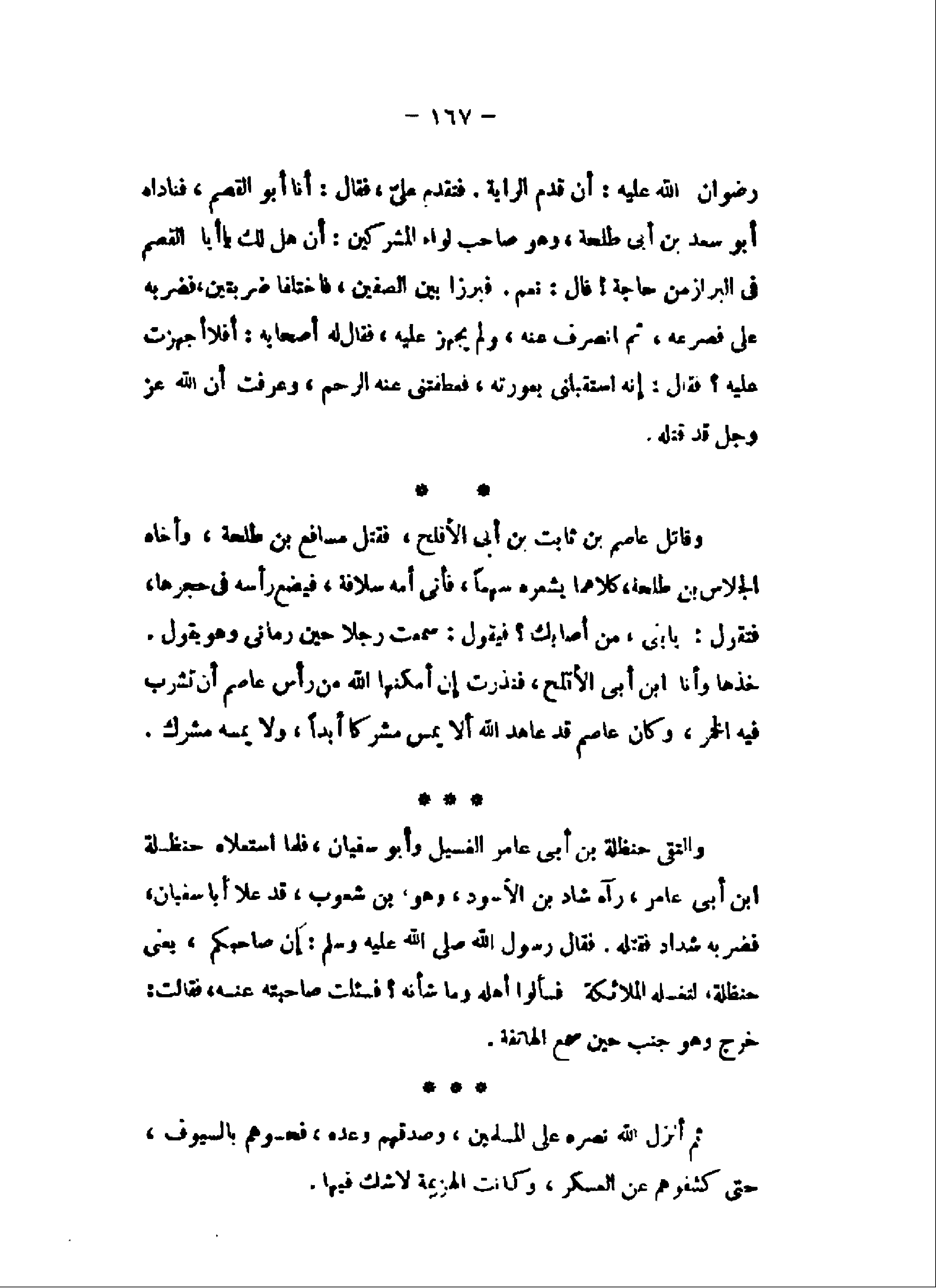 رضوان الله عليه: أن قدم الراية. فتقدم علىّ، فقال: أنا أبو القصم، فناداه أبو سعد بن أبى طلحة، وهو صاحب لواء المشركين: أن هل لك يا أبا القصم فى البراز من حاجة؟ قال: نعم. فبرزا بين الصفين، فاختلفا ضربتين، فضربه على فصرعه، ثم انصرف عنه، ولم يجهز عليه، فقال له أصحابه: أفلا أجهزت عليه؟ فقال: إنه استقبلنى بعورته، فعطفتنى عنه الرحم، وعرفت أن الله عز وجل قد قتله.