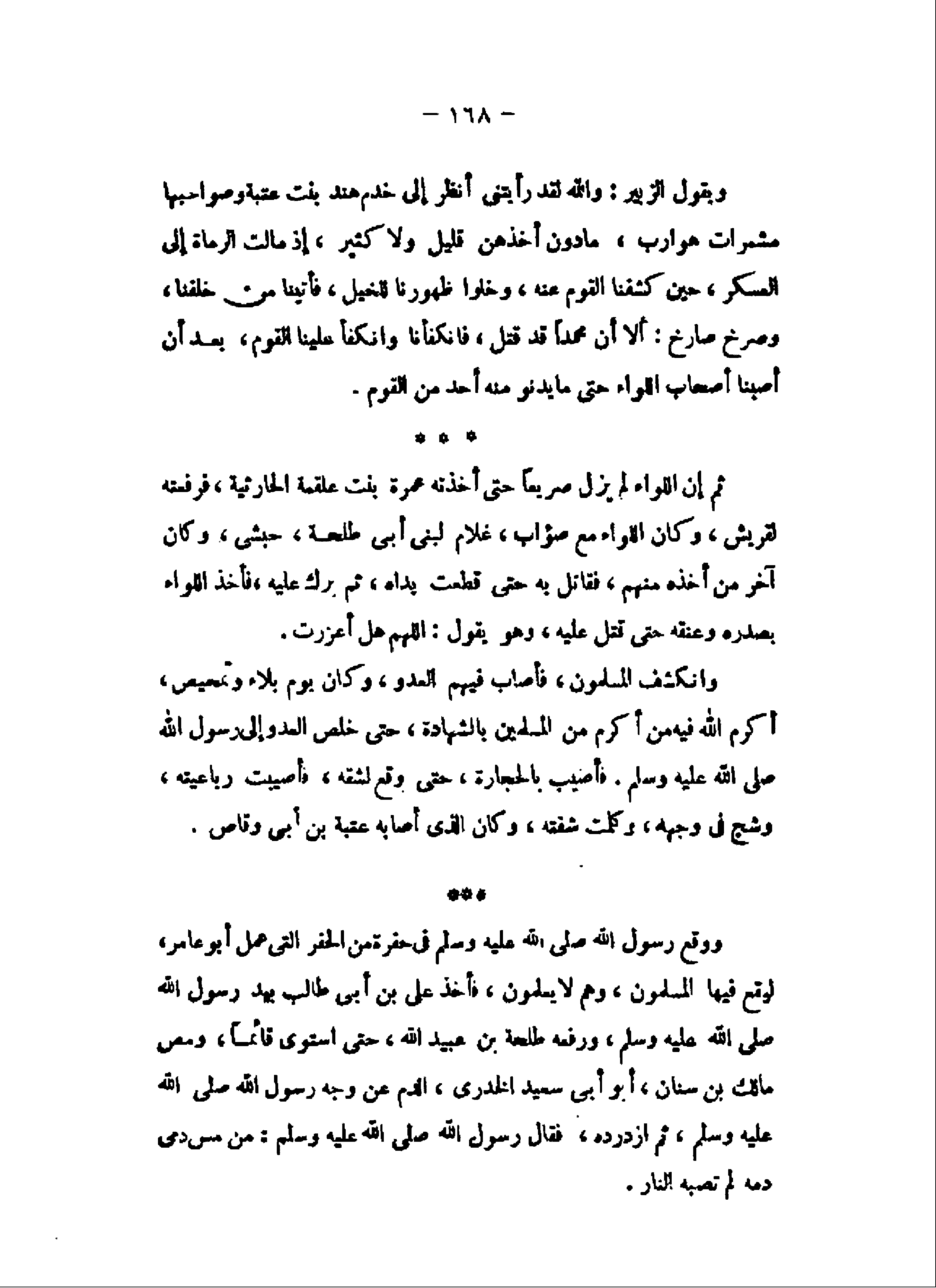 وانكشف المسلمون، فأصاب فيهم العدو، وكان يوم بلاء وتمحيص، أكرم الله فيه من أكرم من المسلمين بالشهادة، حتى خلص العدو إلى رسول الله صلى الله عليه وسلم. فأصيب بالحجارة، حتى وقع لشقه، فأصيبت رباعيته، وشج فى وجهه، وكلمت شفته، وكان الذى أصابه عتبة بن أبى وقاص.