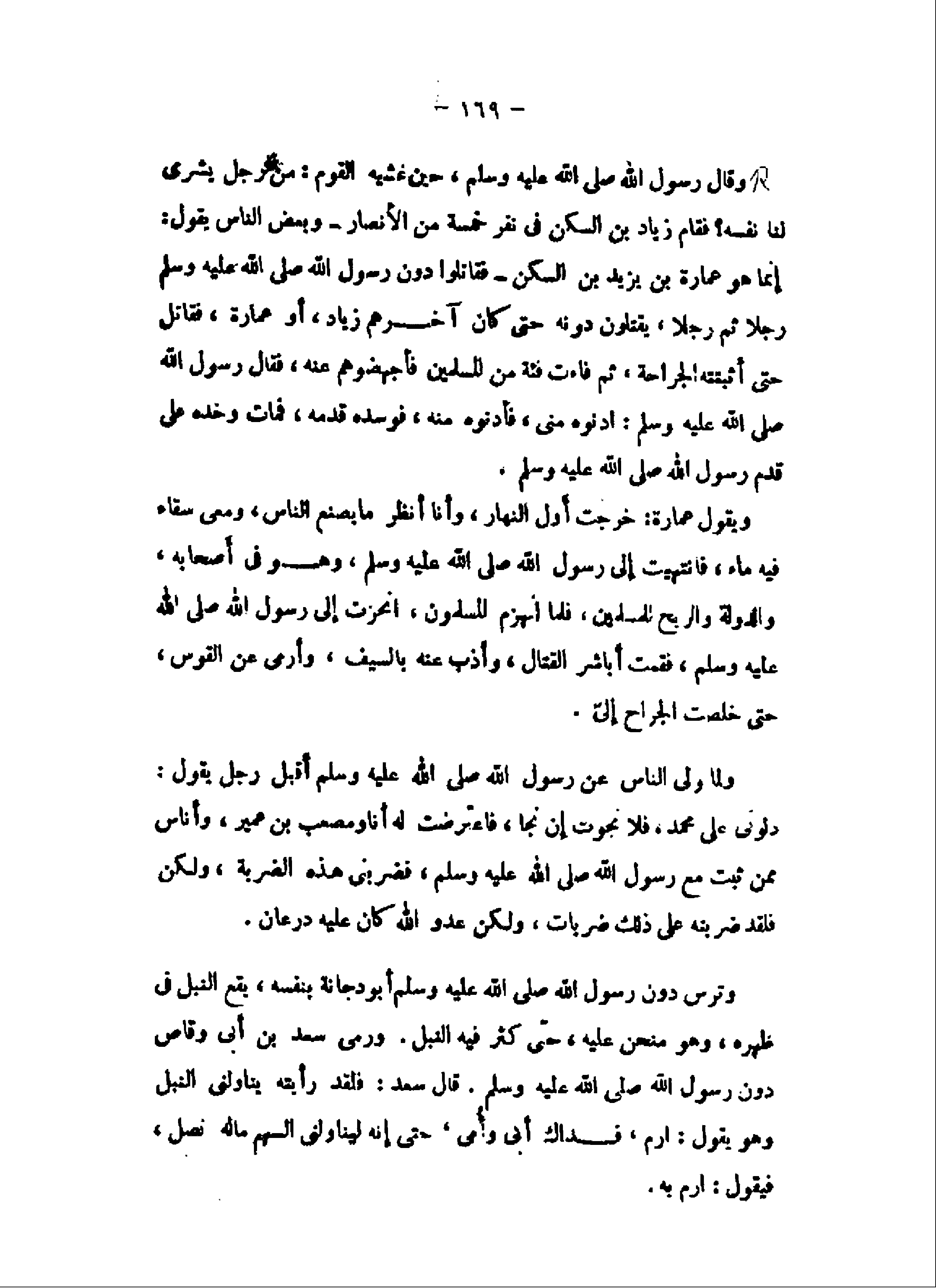 إنما هو عمارة بن يزيد بن السكن- فقاتلوا دون رسول الله صلى الله عليه وسلم رجلا ثم رجلا، يقتلون دونه حتى كان آخرهم زياد، أو عمارة، فقاتل حتى أثبتته الجراحة، ثم فاءت فئة من المسلمين فأجهضوهم عنه، فقال رسول الله صلى الله عليه وسلم: ادنوه منى، فأدنوه منه، فوسده قدمه، فمات وخده على قدم رسول الله صلى الله عليه وسلم.