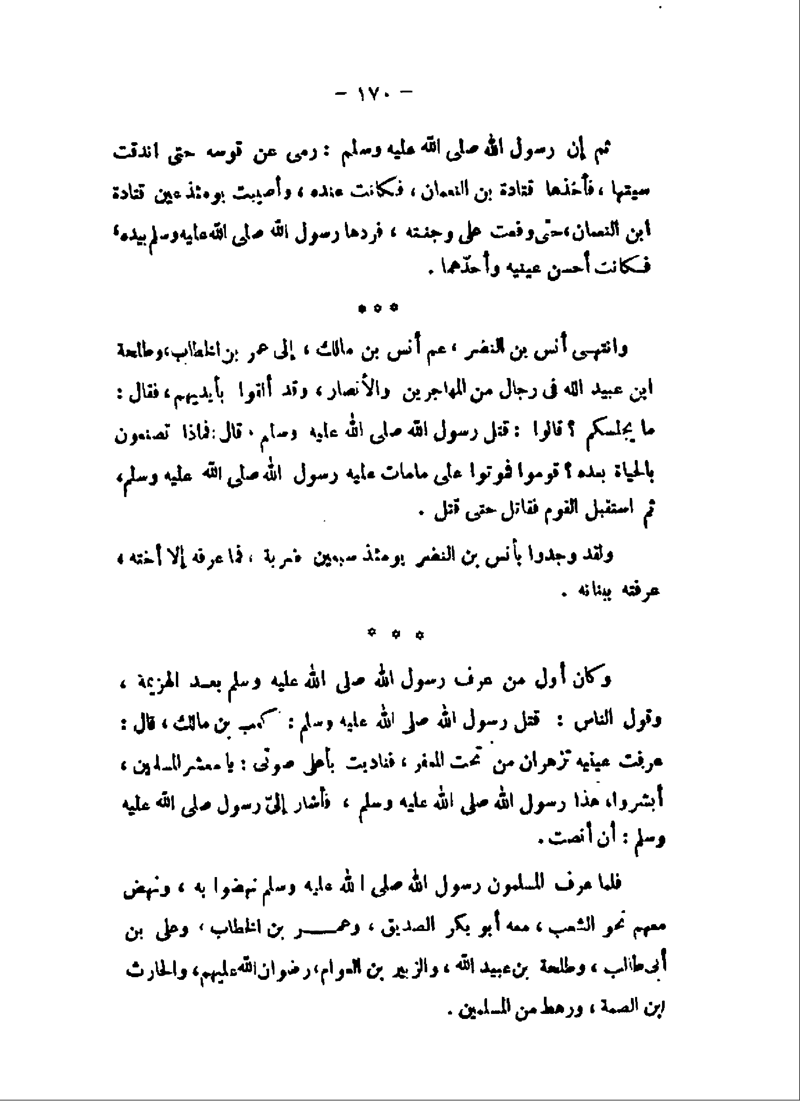 وانتهى أنس بن النضر، عم أنس بن مالك، إلى عمر بن الخطاب، وطلحة ابن عبيد الله فى رجال من المهاجرين والأنصار، وقد ألقوا بأيديهم، فقال: