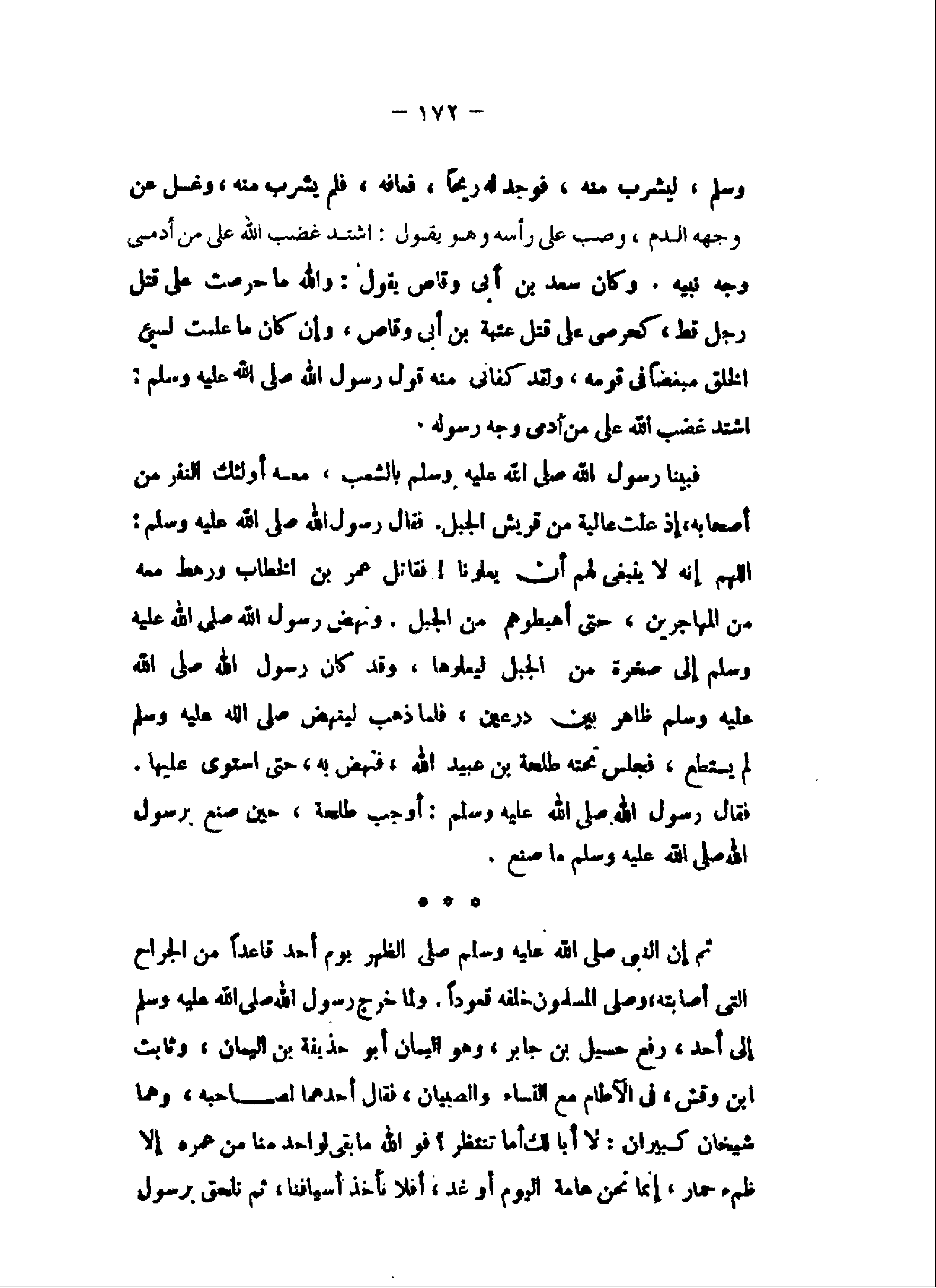 وسلم، ليشرب منه، فوجد له ريحا، فعافه، فلم يشرب منه، وغسل عن وجهه الدم، وصب على رأسه وهو يقول: اشتد غضب الله على من أدمى وجه نبيه. وكان سعد بن أبى وقاص يقول: والله ما حرصت على قتل رجل قط، كحرصى على قتل عتبة بن أبى وقاص، وإن كان ما علمت لسيىء الخلق مبغضا فى قومه، ولقد كفانى منه قول رسول الله صلى الله عليه وسلم:
