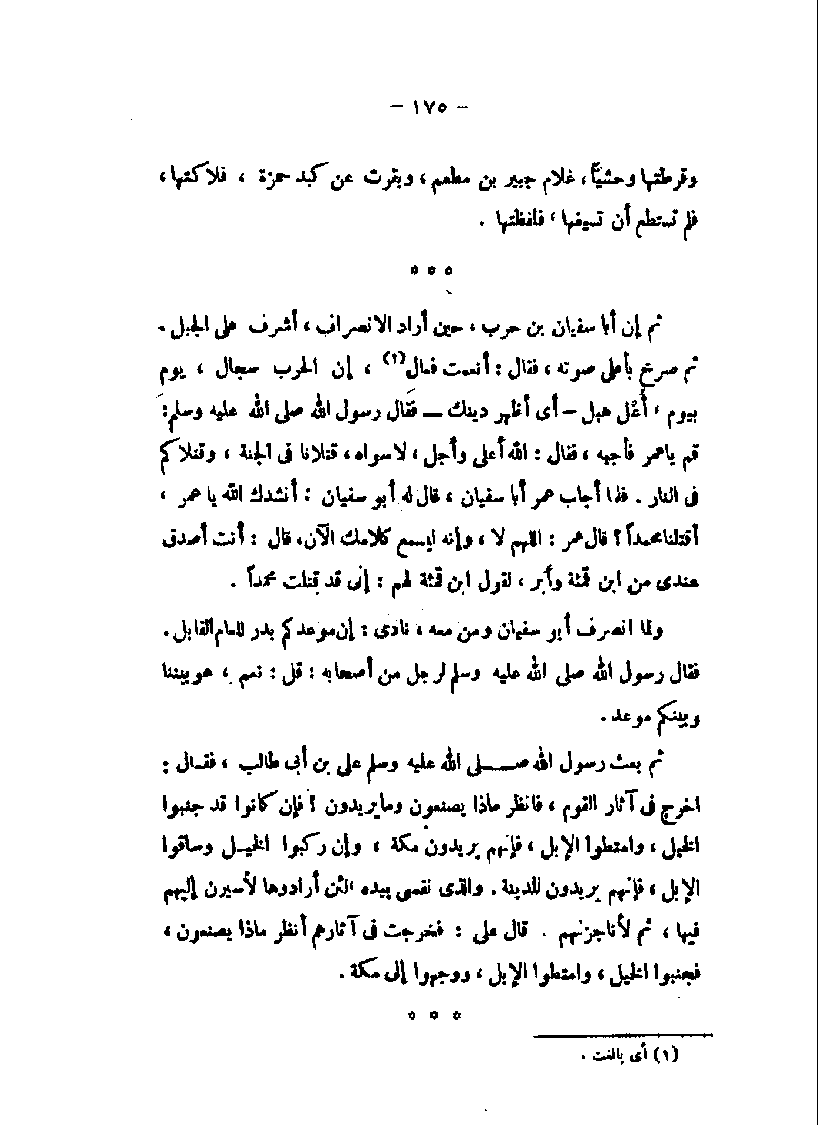 قم يا عمر فأجبه، فقال: الله أعلى وأجل، لاسواه، قتلانا فى الجنة، وقتلاكم فى النار. فلما أجاب عمر أبا سفيان، قال له أبو سفيان: أنشدك الله يا عمر، أقتلنا محمدا؟ قال عمر: اللهم لا، وإنه ليسمع كلامك الآن، قال: أنت أصدق عندى من ابن قمئة وأبر، لقول ابن قمئة لهم: إنى قد قتلت محمدا.
