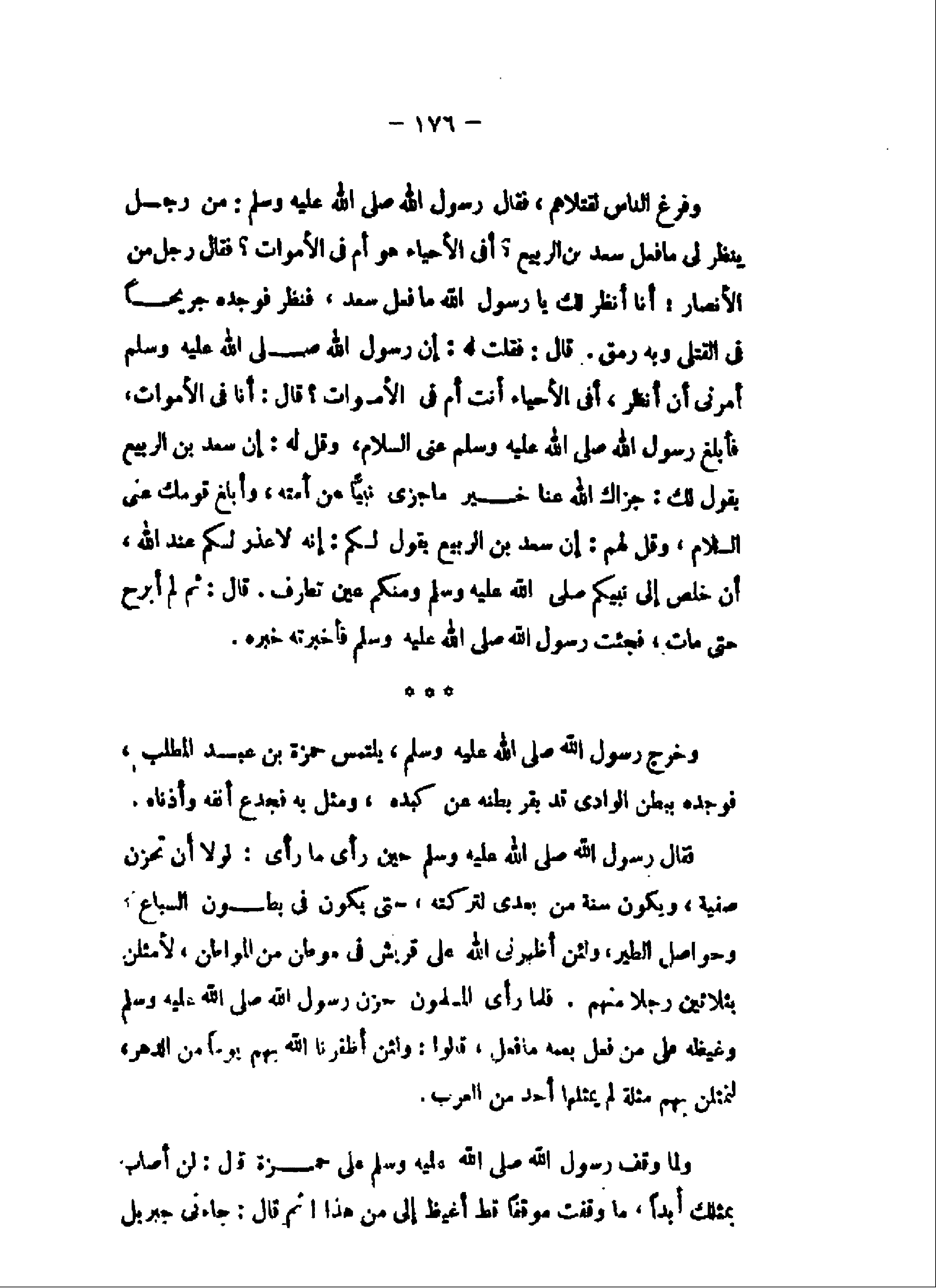 وفرغ الناس لقتلاهم، فقال رسول الله صلى الله عليه وسلم: من رجل ينظر لى ما فعل سعد بن الربيع؟ أفى الأحياء هو أم فى الأموات؟ فقال رجل من الأنصار: أنا أنظر لك يا رسول الله ما فعل سعد، فنظر فوجده جريحا فى القتلى وبه رمق. قال: فقلت له: إن رسول الله صلى الله عليه وسلم أمرنى أن أنظر، أفى الأحياء أنت أم فى الأموات؟ قال: أنا فى الأموات، فأبلغ رسول الله صلى الله عليه وسلم عنى السلام، وقل له: إن سعد بن الربيع يقول لك: جزاك الله عنا خير ما جزى نبيّا عن أمته، وأبلغ قومك عنى السلام، وقل لهم: إن سعد بن الربيع يقول لكم: إنه لا عذر لكم عند الله، أن خلص إلى نبيكم صلى الله عليه وسلم ومنكم عين تطرف. قال: ثم لم أبرح حتى مات، فجئت رسول الله صلى الله عليه وسلم فأخبرته خبره.